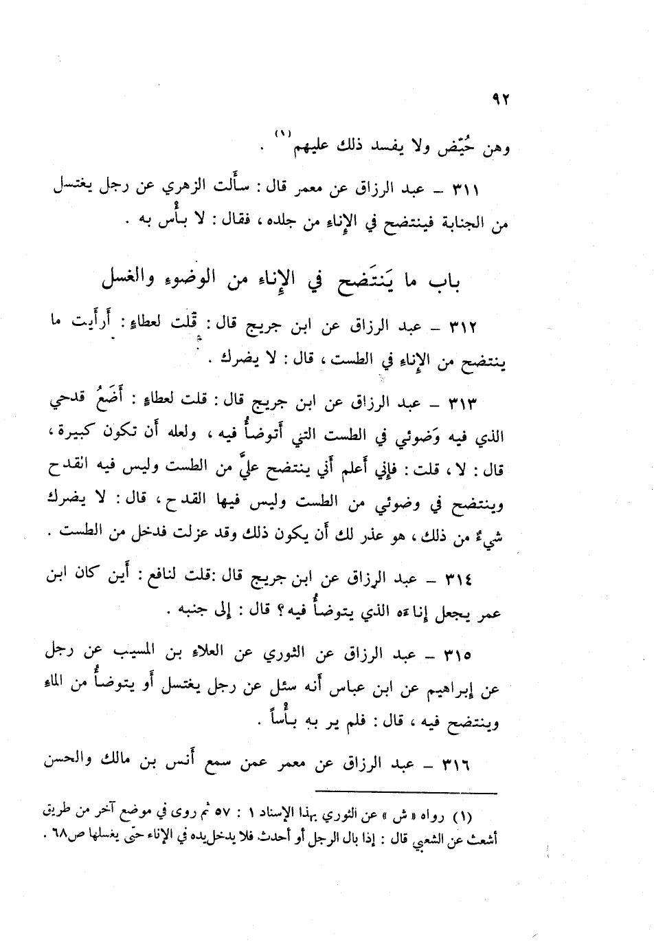 311 - عَبْدُ الرَّزَّاقِ، عَنْ مَعْمَرٍ قَالَ: سَأَلْتُ الزُّهْرِيَّ، عَنْ §رَجُلٍ يَغْتَسِلُ مِنَ الْجَنَابَةِ فَيَنْتَضِحُ فِي الْإِنَاءِ مِنْ جِلْدِهِ فَقَالَ: «لَا بَأْسَ بِهِ»