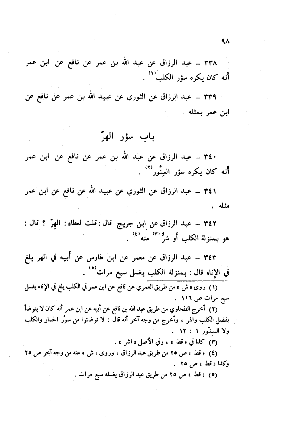 343 - عَبْدُ الرَّزَّاقِ، عَنْ مَعْمَرٍ، عَنِ ابْنِ طَاوُسٍ، عَنْ أَبِيهِ، فِي الْهِرِّ يَلَغُ فِي الْإِنَاءِ قَالَ: «§بِمَنْزِلَةِ الْكَلْبِ يُغْسَلُ سَبْعَ مَرَّاتٍ»