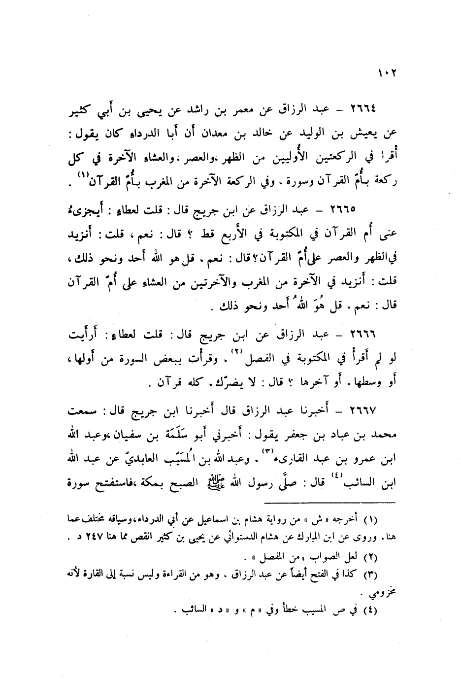 2667 - أَخْبَرَنَا عَبْدُ الرَّزَّاقِ قَالَ: أَخْبَرَنَا ابْنُ جُرَيْجٍ قَالَ: سَمِعْتُ مُحَمَّدَ بْنَ عَبَّادِ بْنِ جَعْفَرٍ يَقُولُ: أَخْبَرَنِي أَبُو سَلَمَةَ بْنُ سُفِيَانَ، وَعَبْدُ اللَّهِ بْنُ عَمْرِو بْنِ عَبْدِ الْقَارِئِ، وَعَبْدُ اللَّهِ بْنُ الْمُسَيَّبِ الْعَابِدِيُّ، عَنْ عَبْدِ اللَّهِ بْنِ السَّائِبِ قَالَ: «§صَلَّى رَسُولُ اللَّهِ صَلَّى اللهُ عَلَيْهِ وَسَلَّمَ الصُّبْحَ بِمَكَّةَ فَاسْتَفْتَحَ سُورَةَ الْمُؤْمِنِينَ حَتَّى إِذَا جَاءَ ذِكْرُ مُوسَى، وَهَارُونَ أَوْ عِيسَى» - ابْنُ عَبَّادٍ يَشُكُّ أَوِ اخْتَلَفُوا عَلَيْهِ - أَخَذَتِ النَّبِيَّ صَلَّى اللهُ عَلَيْهِ وَسَلَّمَ سَعْلَةٌ، فَحَذَفَ، فَرَكَعَ "، وَعَبْدُ اللَّهِ بْنُ السَّائِبِ حَاضِرٌ ذَلِكَ