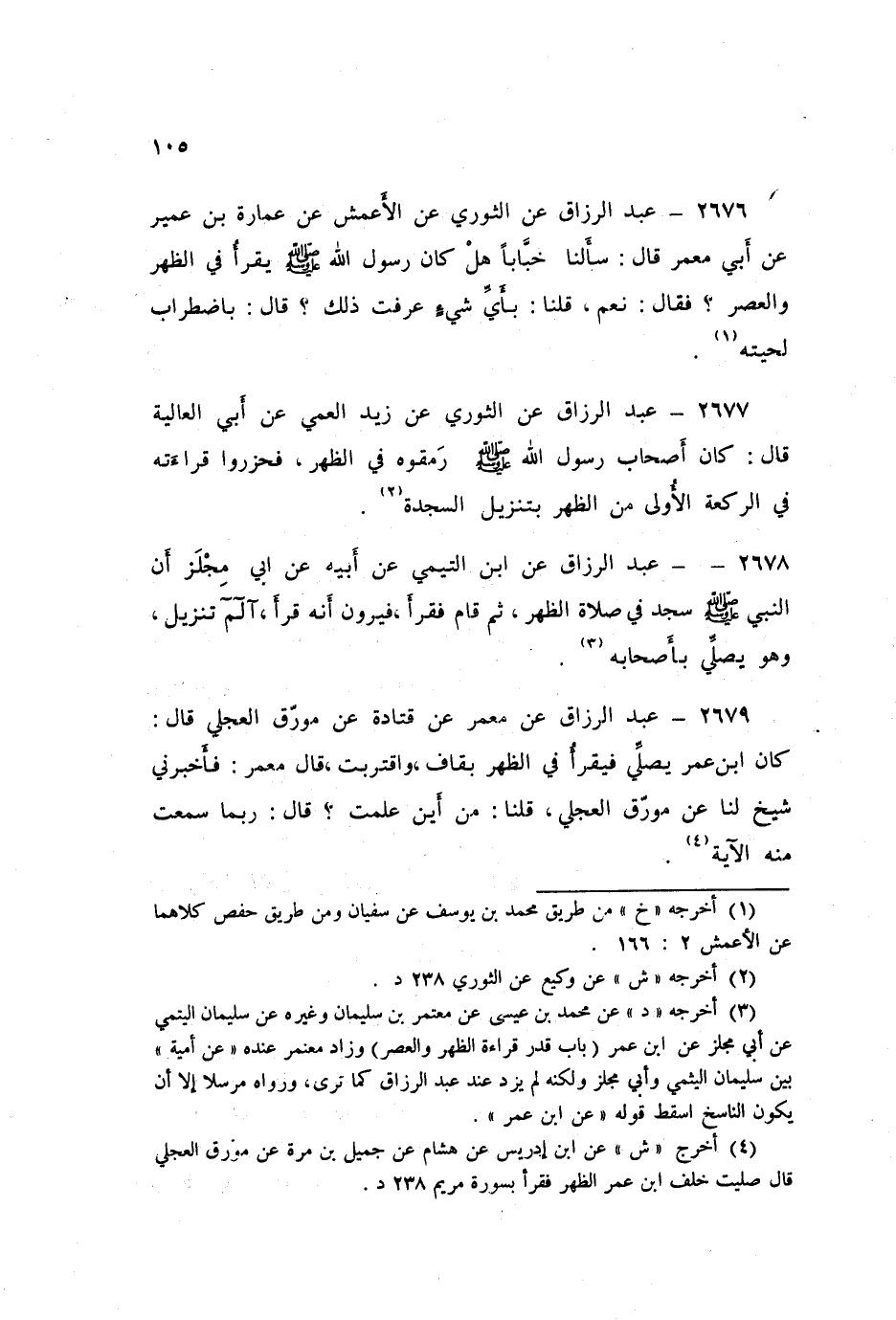 2679 - عَنْ مَعْمَرٍ، عَنْ قَتَادَةَ، عَنْ مُوَرِّقٍ الْعِجْلِيِّ قَالَ: «كَانَ ابْنُ عُمَرَ §يُصَلِّي فِيَقْرَأُ فِي الظُّهْرِ بِقَافٍ، وَاقْتَرَبَتِ» قَالَ مَعْمَرٌ: " فَأَخْبَرَنِي شَيْخٌ لَنَا عَنْ مُوَرِّقٍ الْعِجْلِيِّ، قُلْنَا: مِنْ أَيْنَ عَلِمْتَ؟ قَالَ: رُبَّمَا سَمِعْتُ مِنْهُ الْآيَةَ " عَبْدُ الرَّزَّاقِ،