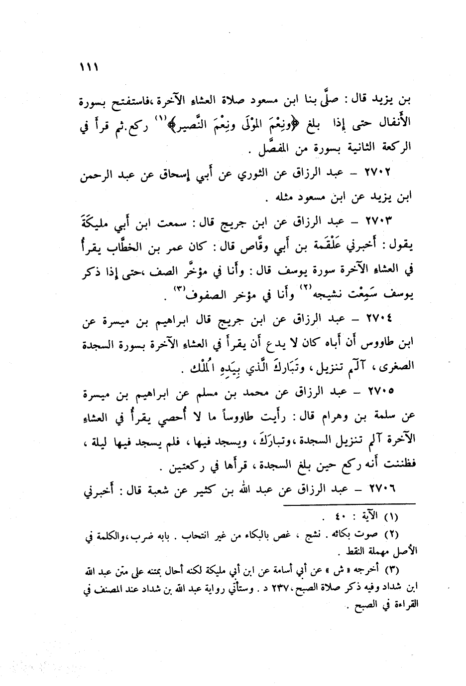 2703 - عَنِ ابْنِ جُرَيْجٍ قَالَ: سَمِعْتُ ابْنَ أَبِي مُلَيْكَةَ يَقُولُ: أَخْبَرَنِي عَلْقَمَةُ بْنُ أَبِي وَقَّاصٍ قَالَ: كَانَ عُمَرُ بْنُ الْخَطَّابِ §يَقْرَأُ فِي الْعِشَاءِ الْآخِرَةِ سُورَةَ يُوسُفَ قَالَ: «وَأَنَا فِي مُؤَخَّرِ الصَّفِّ حَتَّى إِذَا ذَكَرَ يُوسُفَ سَمِعْتُ نَشِيجَهُ، وَأَنَا فِي مُؤَخَّرِ الصُّفُوفِ»