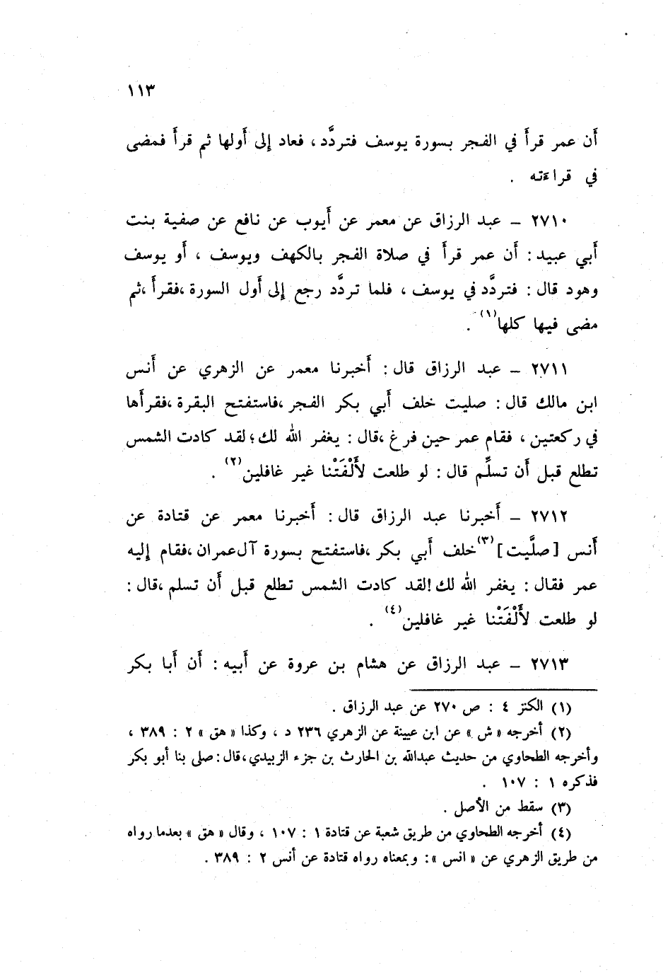 2712 - أَخْبَرَنَا عَبْدُ الرَّزَّاقِ قَالَ: أَخْبَرَنَا مَعْمَرٌ، عَنْ قَتَادَةَ، عَنْ أَنَسٍ: صَلَّيْتُ خَلْفَ أَبِي بَكْرٍ §فَاسْتَفْتَحَ بِسُورَةِ آلِ عِمْرَانَ، فَقَامَ إِلَيْهِ عُمَرُ، فَقَالَ: يَغْفِرُ اللَّهُ لَكَ، لَقَدْ كَادَتِ الشَّمْسُ تَطْلُعُ قَبْلَ أَنْ تُسَلِّمَ قَالَ: «لَوْ طَلَعَتْ لَأَلْفَتْنَا غَيْرَ غَافِلِينَ»
