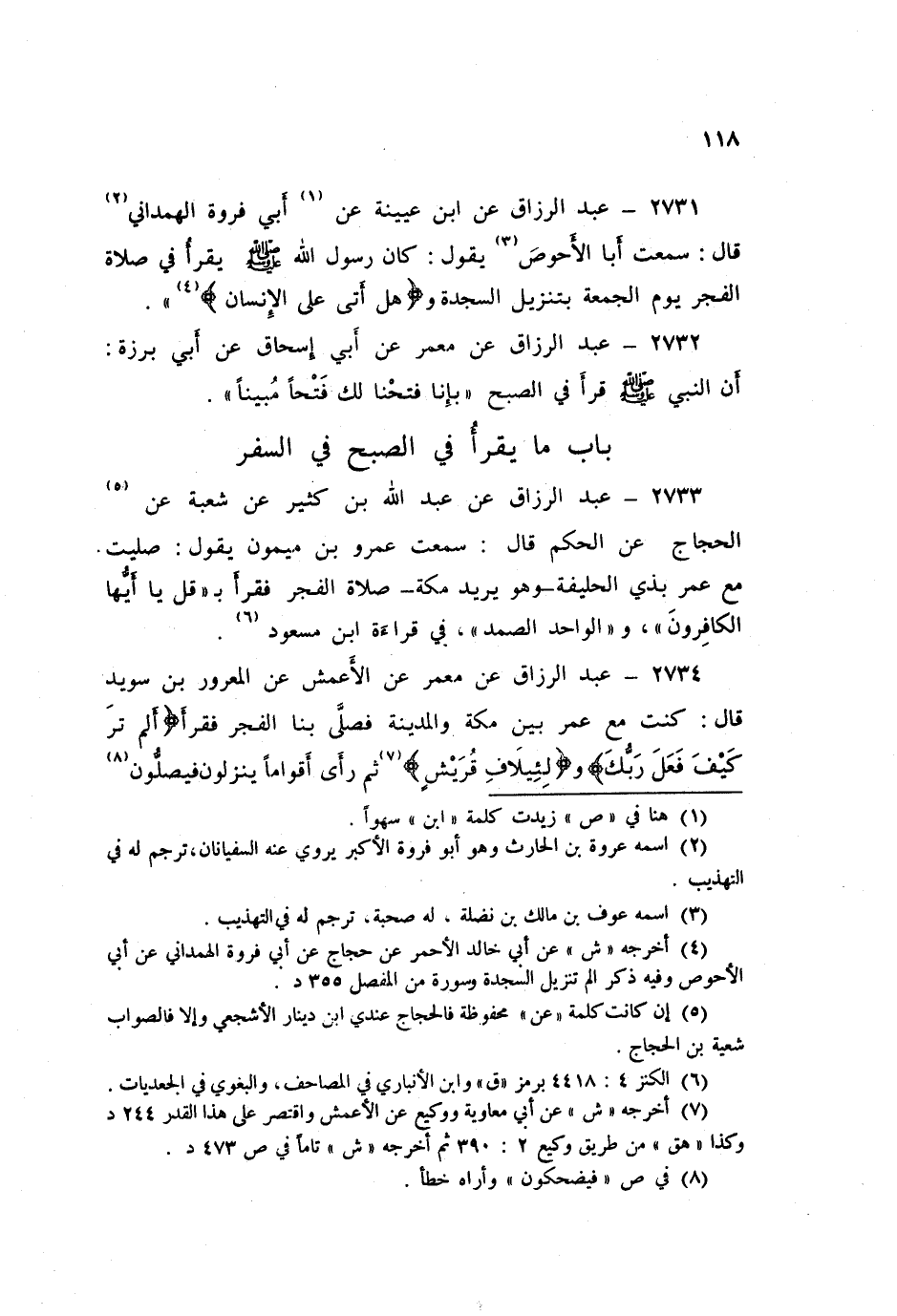 2733 - عَنْ عَبْدِ اللَّهِ بْنِ كَثِيرٍ، عَنْ شُعْبَةَ، عَنِ الْحَجَّاجِ، عَنِ الْحَكَمِ قَالَ: سَمِعْتُ عَمْرَو بْنَ مَيْمُونٍ يَقُولُ: «صَلَّيْتُ مَعَ عُمَرَ بِذِي الْحَلِيفَةِ وَهُوَ يُرِيدُ مَكَّةَ §صَلَاةَ الْفَجْرِ، فَقَرَأَ بِـ قُلْ يَا أَيُّهَا الْكَافِرُونَ، وَالْوَاحِدُ الصَّمَدُ» فِي قِرَاءَةِ ابْنِ مَسْعُودٍ