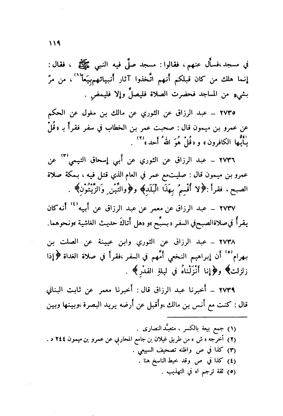 2736 - عَنِ الثَّوْرِيِّ، عَنْ أَبِي إِسْحَاقَ التَّيْمِيِّ، عَنْ عَمْرِو بْنِ مَيْمُونٍ قَالَ: «صَلَّيْتُ مَعَ عُمَرَ فِي الْعَامِ الَّذِي قُتِلَ فِيهِ بِمَكَّةَ §صَلَاةَ الصُّبْحِ، فَقَرَأَ لَا أُقْسِمُ بِهَذَا الْبَلَدِ، وَوَالتِّينِ وَالزَّيْتُونِ»