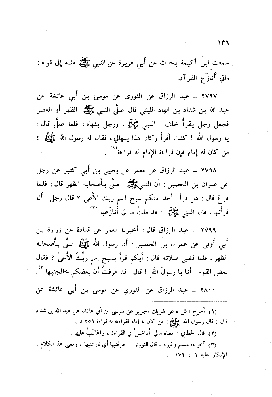 2798 - عَنْ مَعْمَرٍ، عَنْ يَحْيَى بْنِ أَبِي كَثِيرٍ، عَنْ رَجُلٍ، عَنْ عِمْرَانَ بْنِ الْحُصَيْنِ، أَنَّ النَّبِيَّ صَلَّى اللهُ عَلَيْهِ وَسَلَّمَ صَلَّى بِأَصْحَابِهِ الظُّهْرَ قَالَ: فَلَمَّا فَرَغَ قَالَ: «هَلْ قَرَأَ أَحَدٌ مِنْكُمْ سَبِّحِ اسْمَ رَبِّكَ الْأَعْلَى؟» قَالَ رَجُلٌ: أَنَا قَرَأْتُهَا، قَالَ النَّبِيُّ صَلَّى اللهُ عَلَيْهِ وَسَلَّمَ: " قَدْ قُلْتُ: §مَالِي أُنَازَعُهَا "