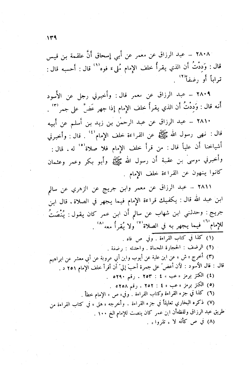 2811 - عَنْ مَعْمَرٍ، وَابْنِ جُرَيْجٍ، عَنِ الزُّهْرِيِّ، عَنْ سَالِمِ بْنِ عَبْدِ اللَّهِ قَالَ: «§يَكْفِيكَ قِرَاءَةُ الْإِمَامِ فِيمَا يَجْهَرُ فِي الصَّلَاةِ»