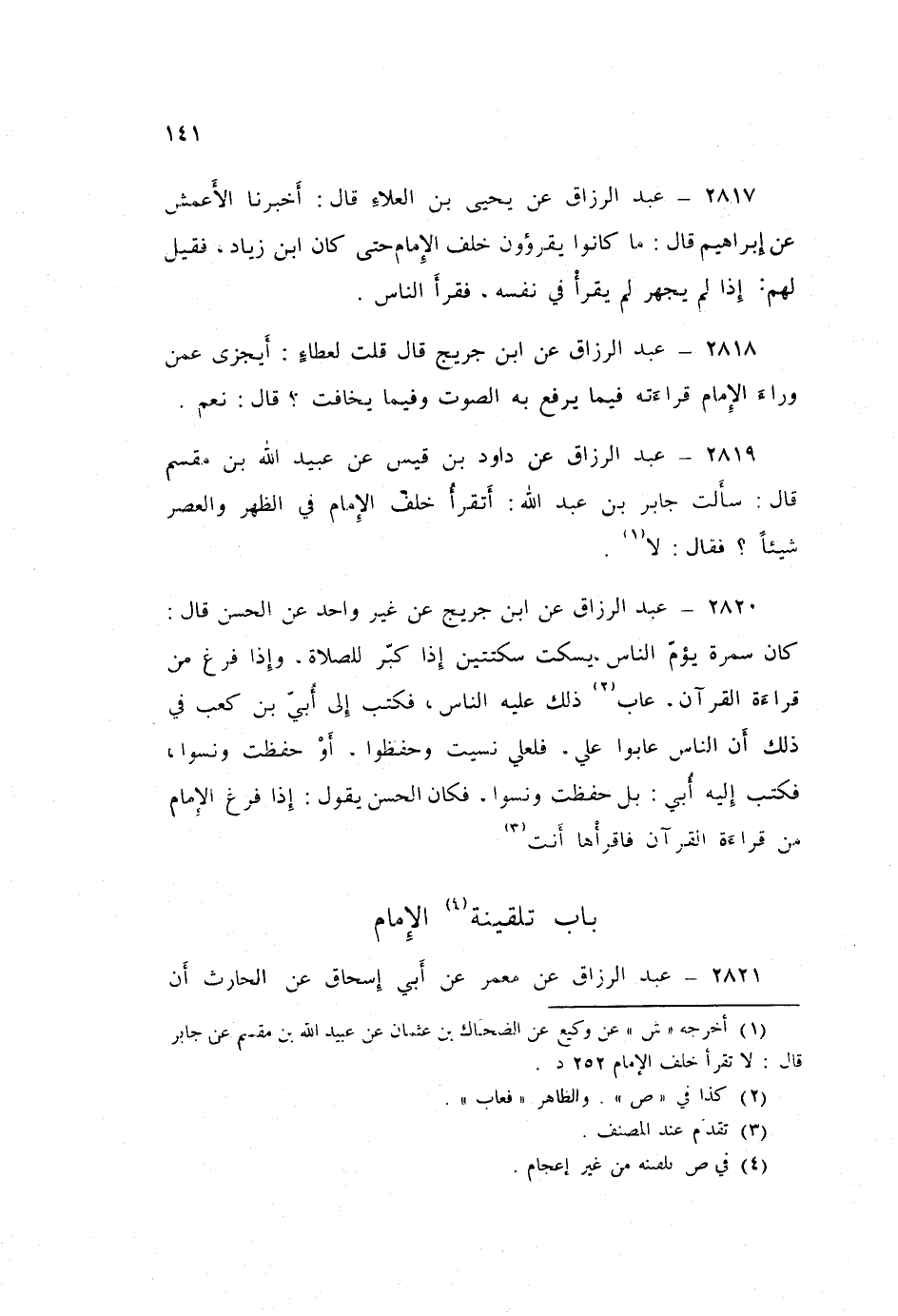 2818 - عَنِ ابْنِ جُرَيْجٍ قَالَ: قُلْتُ لِعَطَاءٍ: §أَيُجْزِي عَمَّنْ وَرَاءَ الْإِمَامِ قِرَاءَتُهُ فِيمَا يَرْفَعُ بِهِ الصَّوْتَ وَفِيمَا يُخَافِتُ؟ قَالَ: «نَعَمْ»