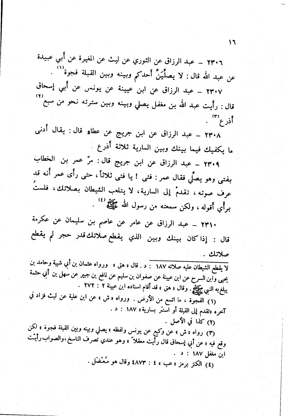2309 - عَنِ ابْنِ جُرَيْجٍ قَالَ: مَرَّ عُمَرُ بْنُ الْخَطَّابِ بِفَتًى وَهُوَ يُصَلِّي، فَقَالَ عُمَرُ: «فَتَى، يَا فَتَى» ثَلَاثًا، حَتَّى رَأَى عُمَرُ أَنَّهُ قَدْ عَرَفَ صَوْتَهُ: «§تَقَدَّمْ إِلَى السَّارِيَةِ، لَا يَتَلَعَّبِ الشَّيْطَانُ بِصَلَاتِكَ، فَلَسْتُ بِرَأْيٍ أَقُولُهُ، وَلَكِنْ سَمِعْتُهُ مِنْ رَسُولِ اللَّهِ صَلَّى اللهُ عَلَيْهِ وَسَلَّمَ»