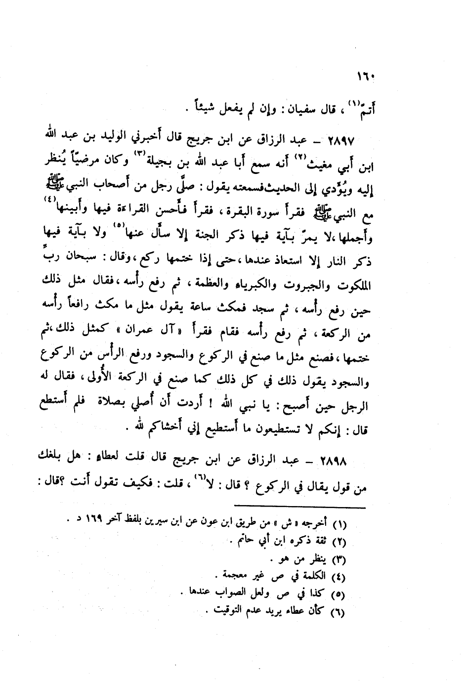 2898 - عَنِ ابْنِ جُرَيْجٍ قَالَ: قُلْتُ لِعَطَاءٍ: هَلْ بَلَغَكَ مِنْ قَوْلٍ يُقَالَ فِي الرُّكُوعِ؟ قَالَ: لَا، قُلْتُ: فَكَيْفَ تَقُولُ أَنْتَ؟ قَالَ -[161]-: " إِذَا لَمْ أَعْجَلْ وَلَمْ يَكُنْ مَعِي شَيْءٌ يَشْغَلُنِي فَإِنِّي أَقُولُ قَوْلًا إِذَا بَلَغْتَهُ فَهُوَ ذَلِكَ، أَقُولُ: §سُبْحَانَكَ وَبِحَمْدِكَ لَا إِلَهَ إِلَّا أَنْتَ ثَلَاثَ مَرَّاتٍ، سُبْحَانَ رَبِّنَا إِنْ كَانَ وَعْدُ رَبِّنَا لَمَفْعُولًا ثَلَاثًا، سُبْحَانَ اللَّهِ الْعَظِيمِ ثَلَاثًا، سُبْحَانَ اللَّهِ وَبِحَمْدِهِ ثَلَاثَ مَرَّاتٍ، سُبْحَانَ الْمَلِكَ الْقُدُّوسِ ثَلَاثَ مَرَّاتٍ، سُبُّوحٌ قُدُّوسٌ رَبُّ الْمَلَائِكَةِ وَالرُّوحِ، سَبَقَتْ رَحْمَةُ رَبِّي غَضَبَهُ ثَلَاثَ مَرَّاتٍ "، قُلْتُ: فَهَلْ بَلَغَكَ أَنَّهُ كَانَ يَقُولُ شَيْئًا مِنْهُنَّ فِي الرُّكُوعِ؟ قَالَ: «لَا» قُلْتُ: فَمَا تَتَّبِعُ فِي ذَلِكَ؟ قَالَ: «أَمَّا سُبْحَانَكَ وَبِحَمْدِكَ لَا إِلَهَ إِلَّا أَنْتَ»