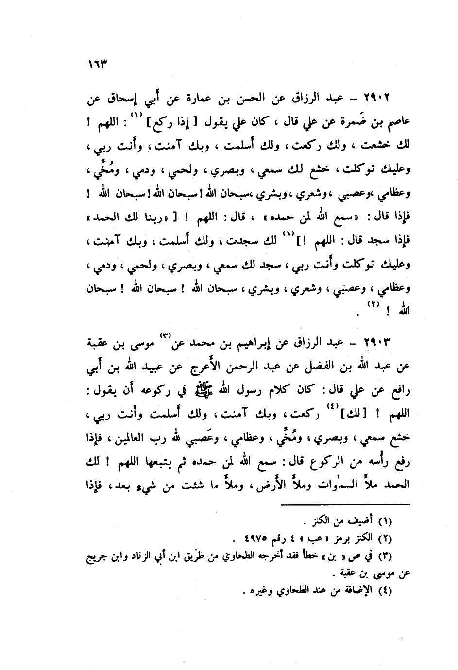 2903 - عَنْ إِبْرَاهِيمَ بْنِ مُحَمَّدٍ، عَنْ مُوسَى بْنِ عُقْبَةَ، عَنْ عَبْدِ اللَّهِ بْنِ الْفَضْلِ، عَنْ عَبْدِ الرَّحْمَنِ الْأَعْرَجِ، عَنْ عُبَيْدِ اللَّهِ بْنِ أَبِي رَافِعٍ، عَنْ عَلِيٍّ قَالَ: " كَانَ كَلَامُ رَسُولِ اللَّهِ صَلَّى اللهُ عَلَيْهِ وَسَلَّمَ فِي رُكُوعِهِ أَنْ يَقُولَ: §اللَّهُمَّ لَكَ رَكَعْتُ، وَبِكَ آمَنْتُ، وَلَكَ أَسْلَمْتُ، وَأَنْتَ رَبِّي، خَشَعَ سَمْعِي وَبَصَرِي وَمُخِّي وَعِظَامِي وَعَصَبِي لِلَّهِ رَبِّ الْعَالَمِينَ، فَإِذَا رَفَعَ رَأْسَهُ مِنَ الرُّكُوعِ قَالَ: سَمِعَ اللَّهُ لِمَنْ حَمِدَهُ - ثُمَّ يُتْبِعُهَا - اللَّهُمَّ لَكَ الْحَمْدُ مِلْءَ السَّمَوَاتِ وَمِلْءَ الْأَرْضِ وَمِلْءَ مَا شِئْتَ مِنْ شَيْءٍ بَعْدُ، فَإِذَا -[164]- سَجَدَ قَالَ فِي سُجُودِهِ: اللَّهُمَّ لَكَ سَجَدْتُ، وَبِكَ آمَنْتُ، وَلَكَ أَسْلَمْتُ، وَأَنْتَ رَبِّي، سَجَدَ وَجْهِيَ لِلَّذِي خَلَقَهُ، وَشَقَّ سَمْعَهُ وَبَصَرَهُ، تَبَارَكَ اللَّهُ أَحْسَنُ الْخَالِقِينَ " عَبْدُ الرَّزَّاقِ،