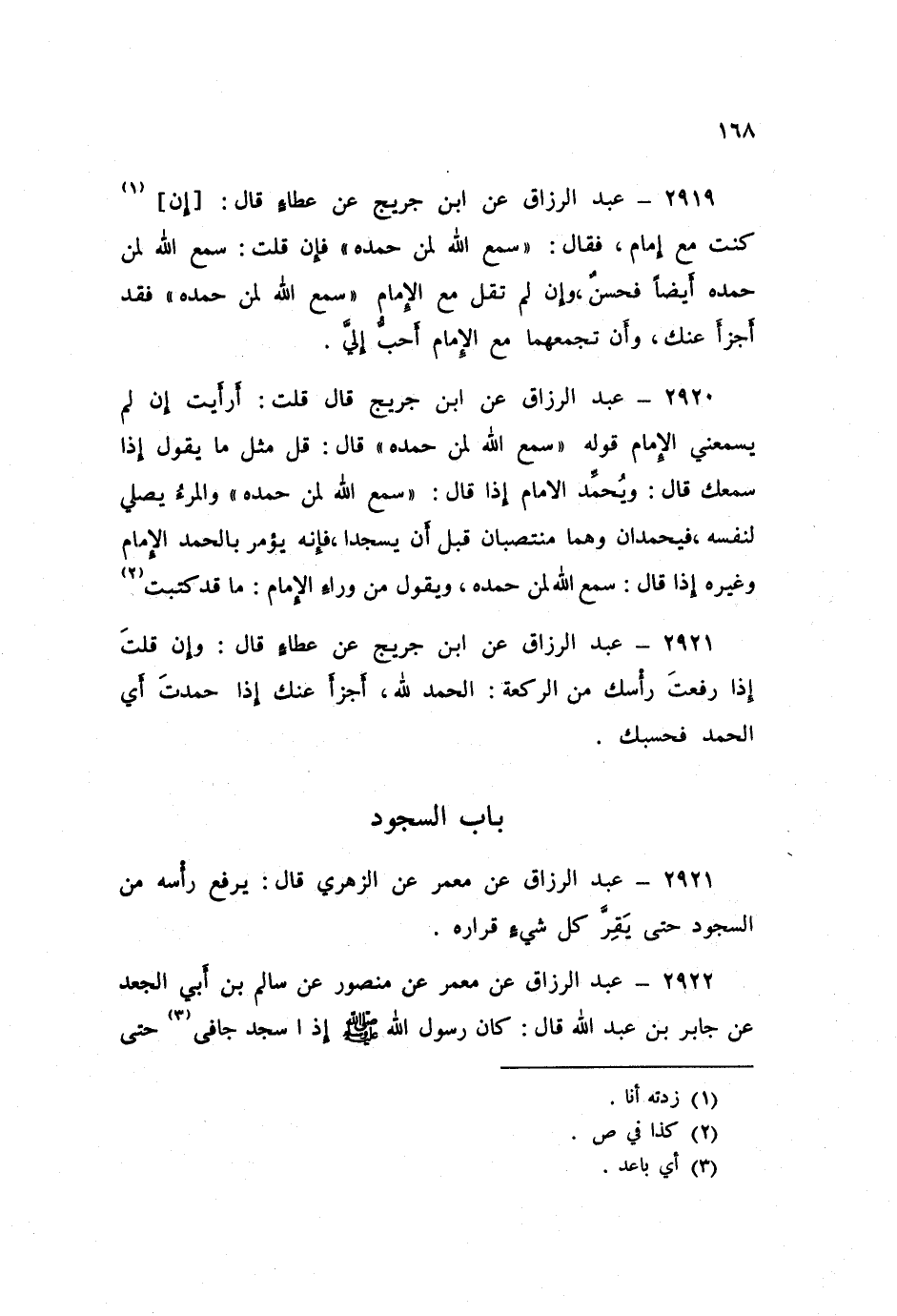 2922 - عَنْ مَعْمَرٍ، عَنْ مَنْصُورٍ، عَنْ سَالِمِ بْنِ أَبِي الْجَعْدِ، عَنْ جَابِرِ بْنِ عَبْدِ اللَّهِ قَالَ: «كَانَ رَسُولُ اللَّهِ صَلَّى اللهُ عَلَيْهِ وَسَلَّمَ §إِذَا سَجَدِ جَافَى حَتَّى يُرَى بَيَاضُ إِبْطَيْهِ»