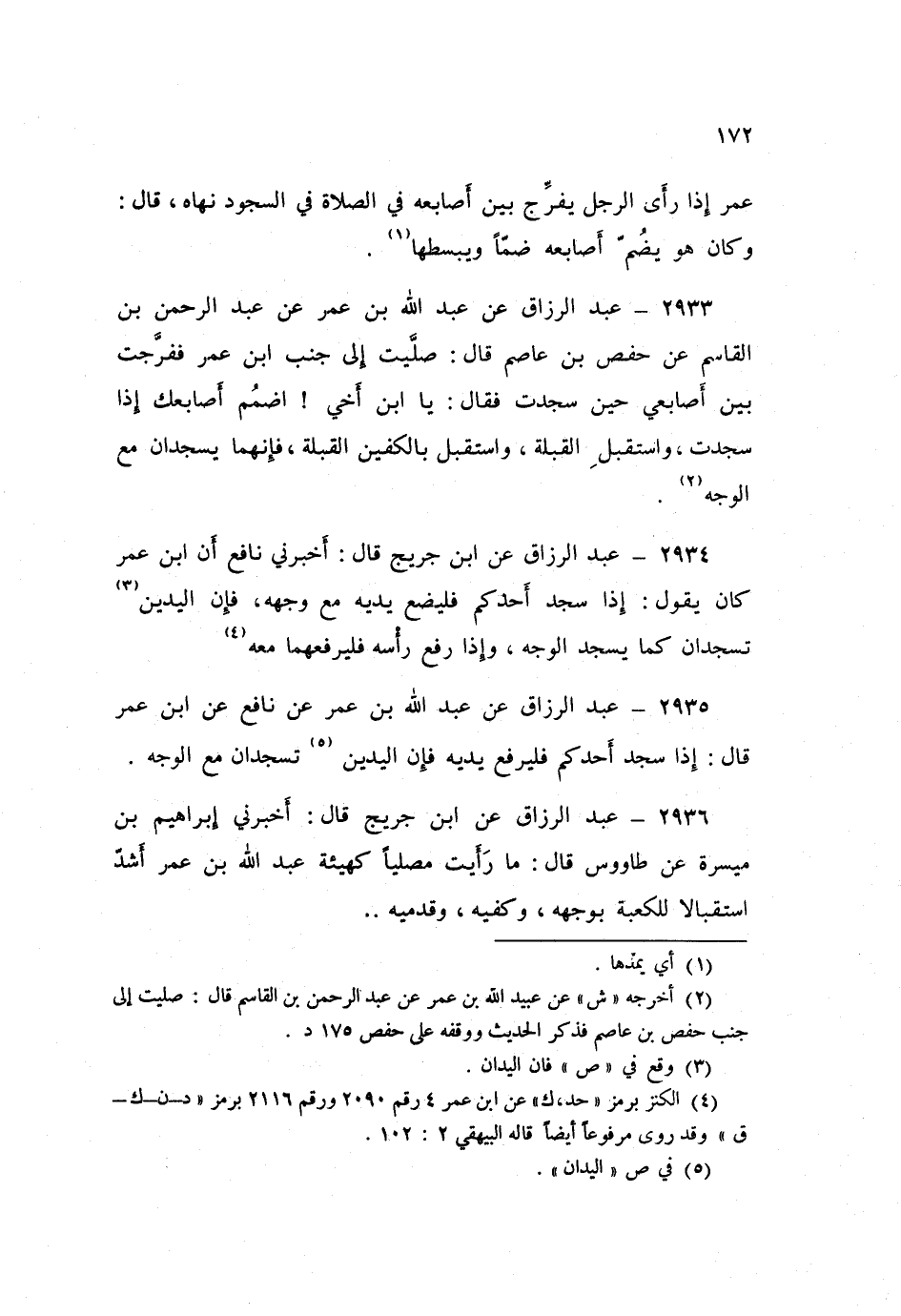 2936 - عَنِ ابْنِ جُرَيْجٍ قَالَ: أَخْبَرَنِي إِبْرَاهِيمُ بْنُ مَيْسَرَةَ، عَنْ طَاوُسٍ قَالَ: «§مَا رَأَيْتُ مُصَلِّيًا كَهَيْئَةِ عَبْدِ اللَّهِ بْنِ عُمَرَ أَشَدَّ اسْتِقْبَالًا لِلْكَعْبَةِ بِوَجْهِهِ، وَكَفَّيْهِ، وَقَدَمَيْهِ»