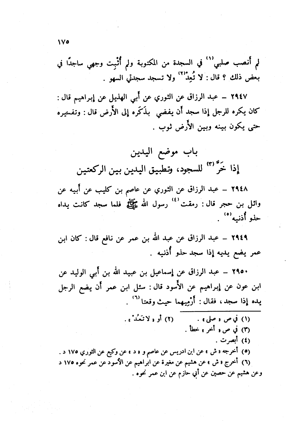 2949 - عَنْ عَبْدِ اللَّهِ بْنِ عُمَرَ، عَنْ نَافِعٍ قَالَ: «كَانَ ابْنُ عُمَرَ §يَضَعُ يَدَيْهِ إِذَا سَجَدَ حَذْوَ أُذُنَيْهِ»