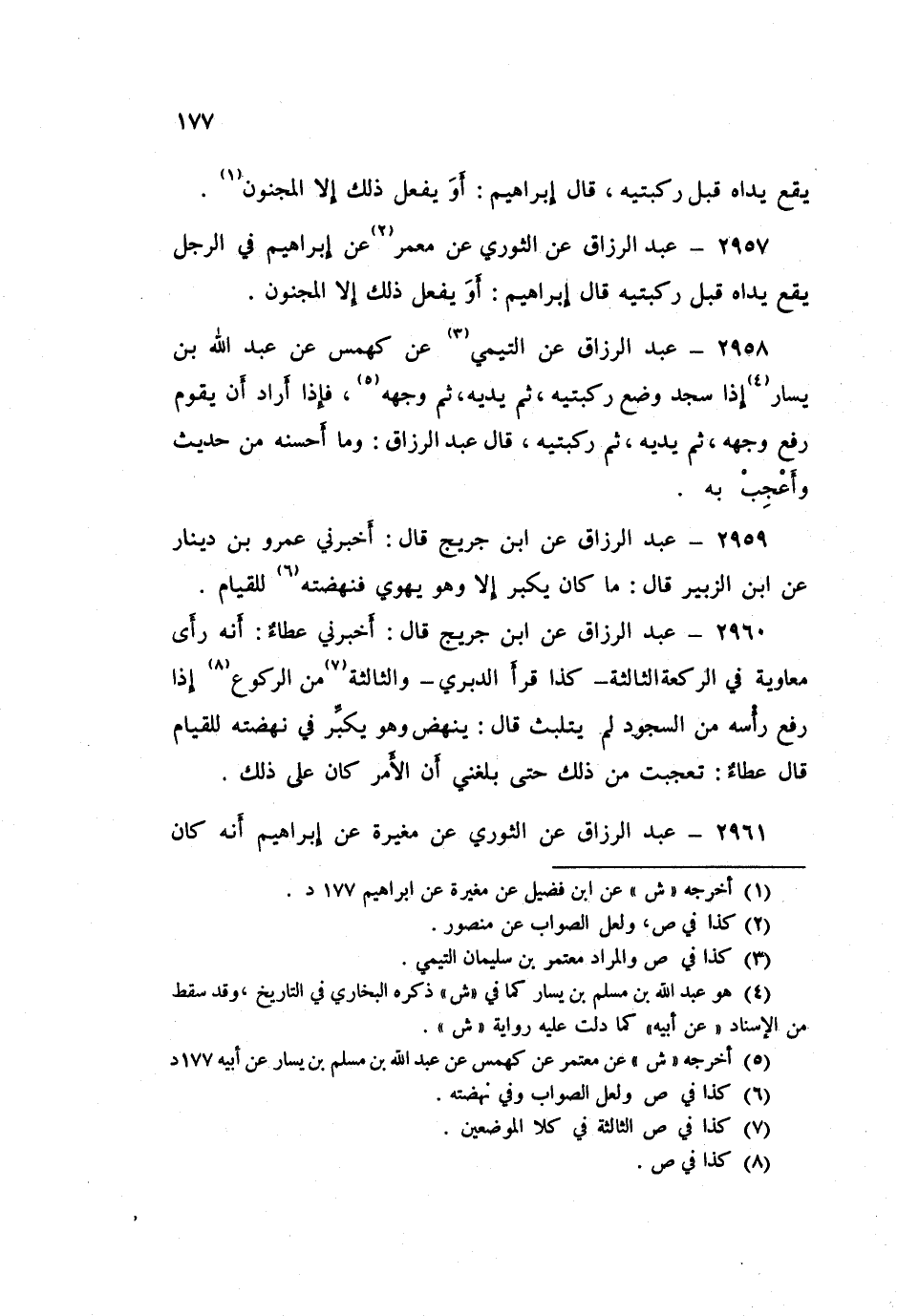 2958 - عَنِ التَّيْمِيِّ، عَنْ كَهْمَسٍ، عَنْ عَبْدِ اللَّهِ بْنِ يَسَارٍ، «§إِذَا سَجَدَ وَضَعَ رُكْبَتَيْهِ ثُمَّ يَدَيْهِ ثُمَّ وَجْهَهُ، فَإِذَا أَرَادَ أَنْ يَقُومَ رَفَعَ وَجْهَهُ، ثُمَّ يَدَيْهِ، ثُمَّ رُكْبَتَيْهِ» قَالَ عَبْدُ الرَّزَّاقِ: وَمَا أَحْسَنَهُ مِنْ حَدِيثٍ وَأَعْجِبْ بِهِ