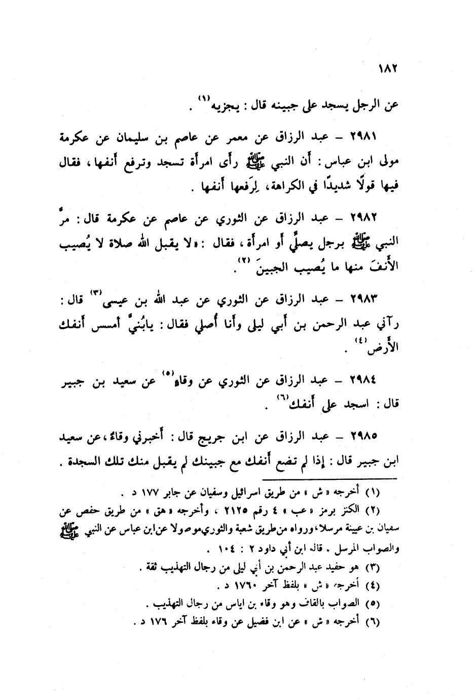 2985 - عَنِ ابْنِ جُرَيْجٍ قَالَ: أَخْبَرَنِي وِقَاءٌ، عَنْ سَعِيدِ بْنِ جُبَيْرٍ قَالَ: «§إِذَا لَمْ تَضَعْ أَنْفَكَ مَعَ جَبِينِكَ لَمْ يُقْبَلْ مِنْكَ تِلَكَ السَّجْدَةُ»