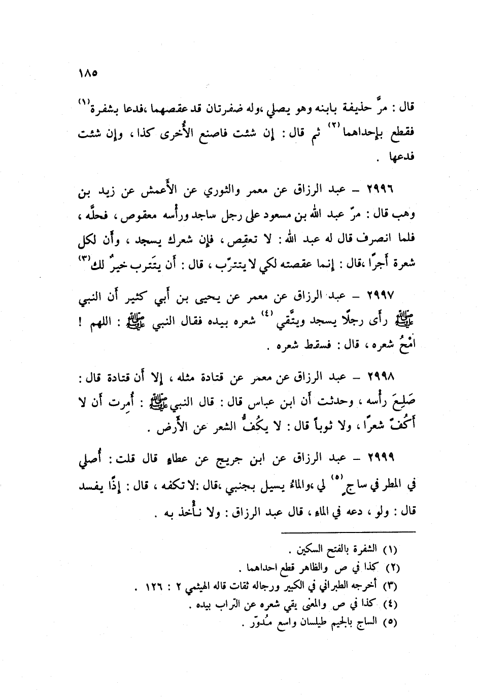 2997 - عَنْ مَعْمَرٍ، عَنْ يَحْيَى بْنِ أَبِي كَثِيرٍ، أَنَّ النَّبِيَّ صَلَّى اللهُ عَلَيْهِ وَسَلَّمَ رَأَى رَجُلًا يَسْجُدُ وَيَتَّقِي شَعْرَهُ بِيَدِهِ، فَقَالَ النَّبِيُّ صَلَّى اللهُ عَلَيْهِ وَسَلَّمَ: «§اللَّهُمَّ امْحُ شَعْرَهُ» قَالَ: فَسَقَطَ شَعْرُهُ عَبْدُ الرَّزَّاقِ،