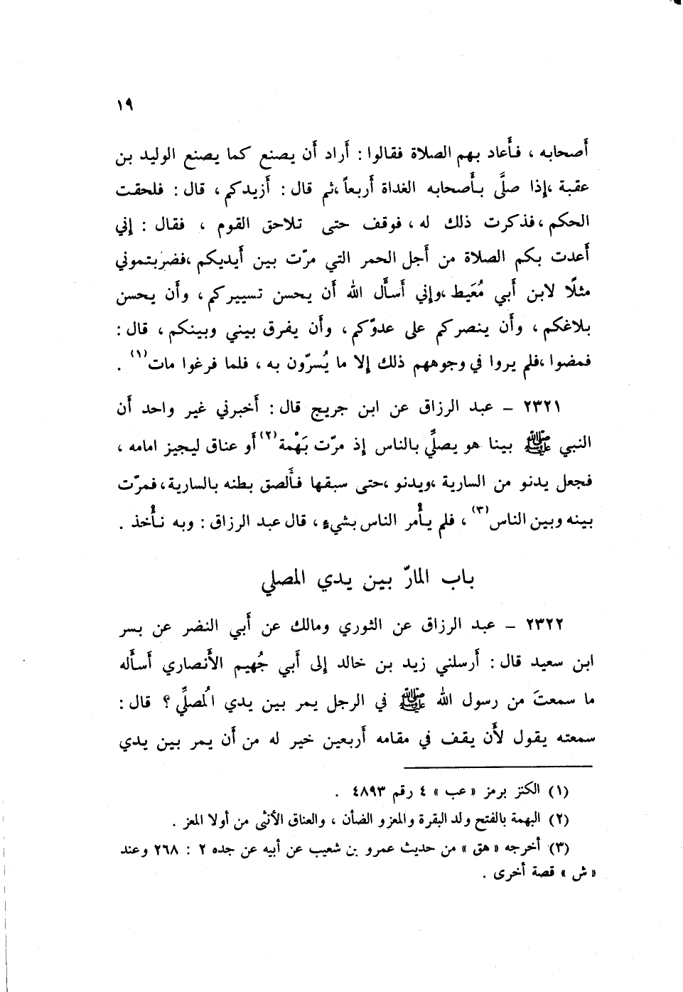 2321 - عَنِ ابْنِ جُرَيْجٍ قَالَ: أَخْبَرَنِي غَيْرُ وَاحِدٍ: «أَنَّ النَّبِيَّ صَلَّى اللهُ عَلَيْهِ وَسَلَّمَ بَيْنَا هُوَ §يُصَلِّي بِالنَّاسِ إِذْ مَرَّتْ بَهْمَةٌ أَوْ عَنَاقٌ لِيُجِيزَ أَمَامَهُ، فَجَعَلَ يَدنُو مِنَ السَّارِيَةِ، وَيَدْنُو، حَتَّى سَبَقَهَا، فَأَلْصَقَ بَطْنَهُ بِالسَّارِيَةِ، فَمَرَّتْ بَيْنَهُ وَبَيْنَ النَّاسِ فَلَمْ يَأْمُرِ النَّاسَ بِشَيْءٍ»، قَالَ عَبْدُ الرَّزَّاقِ: «وَبِهِ نَأْخُذُ»