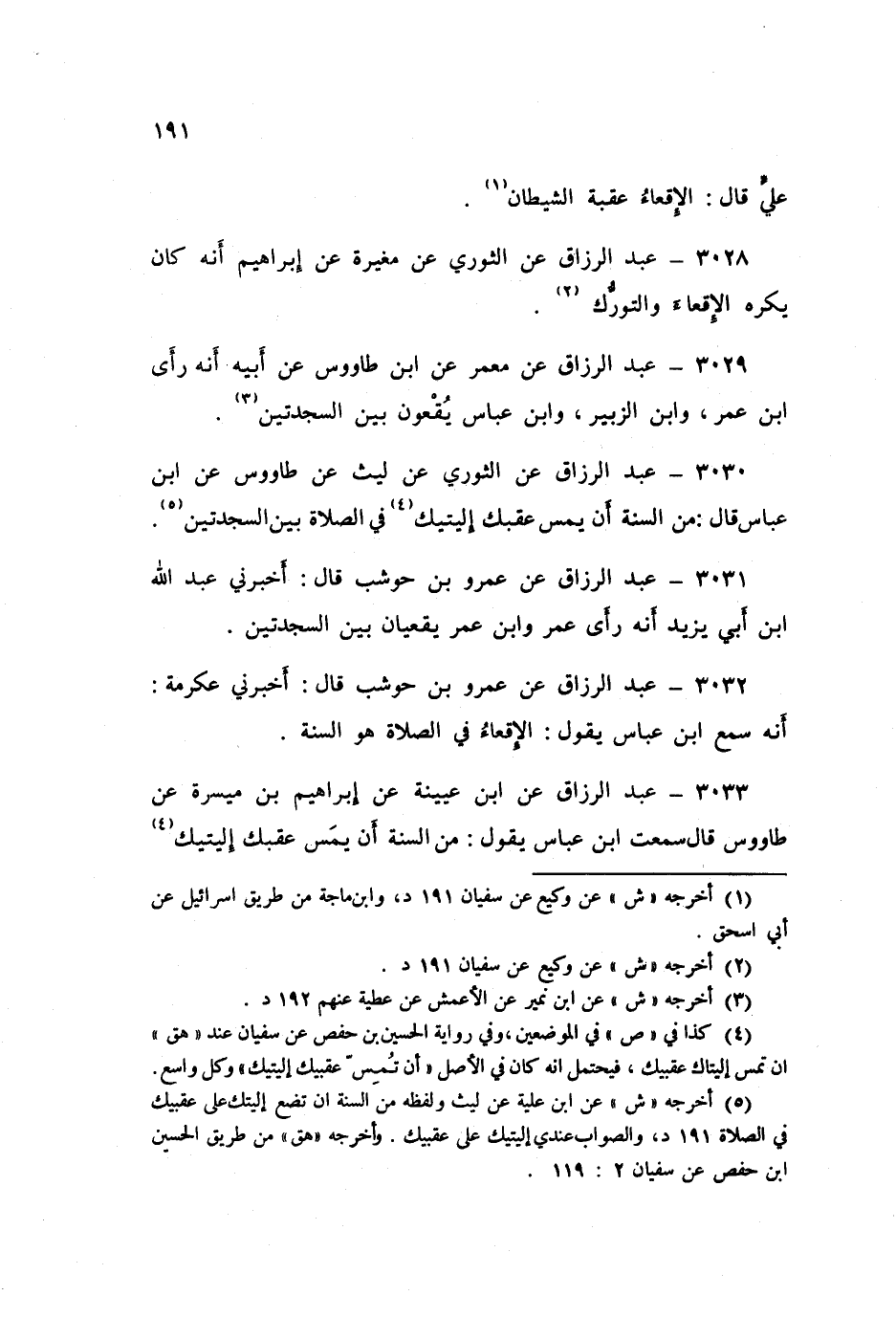 3030 - عَنِ الثَّوْرِيِّ، عَنْ لَيْثٍ، عَنْ طَاوُسٍ، عَنِ ابْنِ عَبَّاسٍ قَالَ: «§مِنَ السُّنَّةِ أَنْ يَمَسَّ عَقِبُكَ إِلْيَتَيْكَ فِي الصَّلَاةِ بَيْنَ السَّجْدَتَيْنِ»