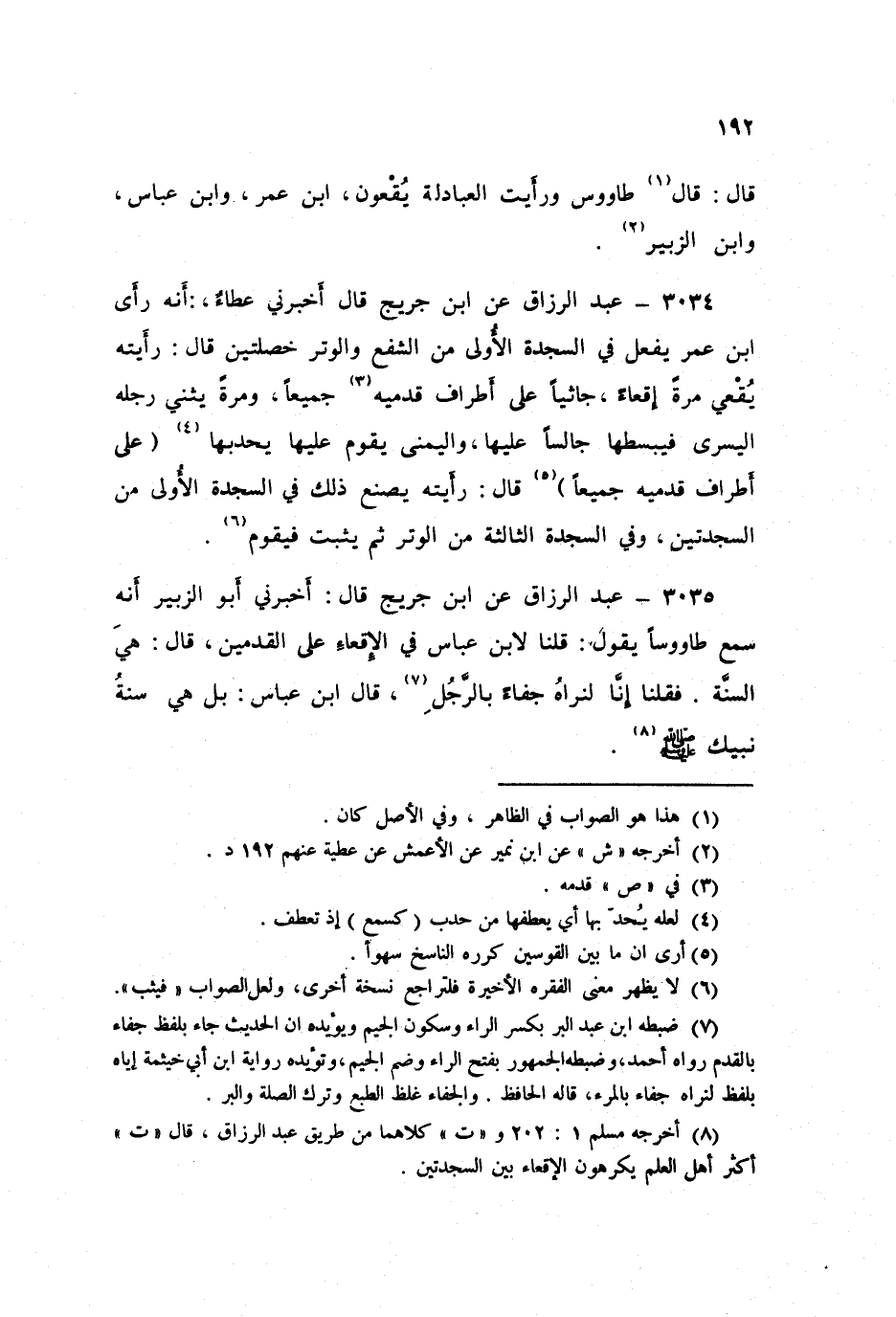 3035 - عَنِ ابْنِ جُرَيْجٍ قَالَ: أَخْبَرَنِي أَبُو الزُّبَيْرِ، أَنَّهُ سَمِعَ طَاوُسًا يَقُولُ: قُلْنَا لِابْنِ عَبَّاسٍ فِي §الْإِقْعَاءِ عَلَى الْقَدَمَيْنِ؟ قَالَ: «هِيَ السُّنَّةُ»، فَقُلْنَا: إِنَّا لَنَرَاهُ جَفَاءً بِالرَّجُلِ، قَالَ ابْنُ عَبَّاسٍ: «بَلْ هِيَ سُنَّةُ نَبِيِّكَ صَلَّى اللهُ عَلَيْهِ وَسَلَّمَ»