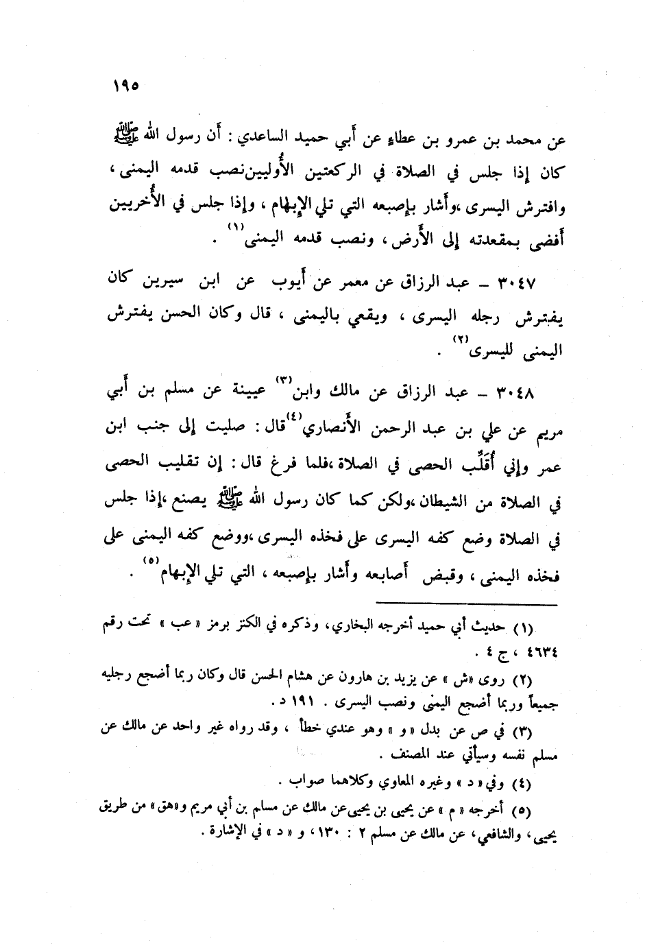 3048 - عَنْ مَالِكٍ، وَابْنِ عُيَيْنَةَ، عَنْ مُسْلِمِ بْنِ أَبِي مَرْيَمَ، عَنْ عَلِيِّ بْنِ عَبْدِ الرَّحْمَنِ الْأَنْصَارِيِّ قَالَ: صَلَّيْتُ إِلَى جَنْبِ ابْنِ عُمَرَ، وَإِنِّي أُقَلِّبُ الْحَصَى فِي الصَّلَاةِ، فَلَمَّا فَرَغَ قَالَ: «إِنَّ تَقْلِيبَ الْحَصَى فِي الصَّلَاةِ مِنَ الشَّيْطَانِ، وَلَكِنْ كَمَا كَانَ رَسُولُ اللَّهِ صَلَّى اللهُ عَلَيْهِ وَسَلَّمَ يَصْنَعُ §إِذَا جَلَسَ فِي الصَّلَاةِ وَضَعَ كَفَّهُ الْيُسْرَى عَلَى فَخِذِهِ الْيُسْرَى، وَوَضَعَ كَفَّهُ الْيُمْنَى عَلَى فَخِذِهِ الْيُمْنَى، وَقَبَضَ أَصَابِعَهُ» وَأَشَارَ بِإِصْبَعِهِ الَّتِي تَلِي الْإِبْهَامَ