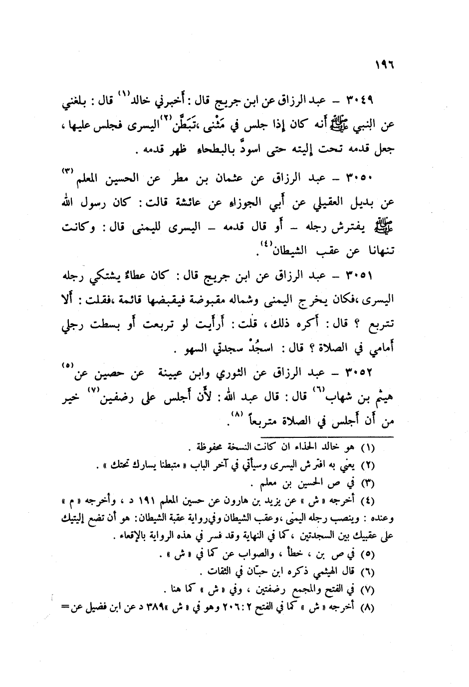 3051 - عَنِ ابْنِ جُرَيْجٍ قَالَ: كَانَ عَطَاءٌ يَشْتَكِي رِجْلَهُ الْيُسْرَى، فَكَانَ يُخْرِجُ الْيُمْنَى وَشِمَالُهُ مَقْبُوضَةٌ، فَيَقْبِضُهَا قَائِمَةً، فَقُلْتُ: §أَلَا تَتَرَبَّعُ؟ قَالَ: «أَكْرَهُ ذَلِكَ»، قُلْتُ: أَرَأَيْتَ لَوْ تَرَبَّعْتُ أَوْ بَسَطْتُ رِجْلِي أَمَامِي فِي الصَّلَاةِ؟ قَالَ: «اسْجُدْ سَجْدَتَيِ السَّهْوِ»