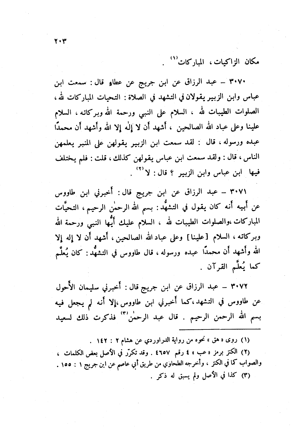 3071 - عَنِ ابْنِ جُرَيْجٍ قَالَ: أَخْبَرَنِي ابْنُ طَاوُسٍ، عَنْ أَبِيهِ، " أَنَّهُ كَانَ يَقُولُ فِي §التَّشَهُّدِ: بِسْمِ اللَّهِ الرَّحْمَنِ الرَّحِيمِ، التَّحِيَّاتُ الْمُبَارَكَاتُ وَالصَلَوَاتُ الطَّيِّبَاتُ لِلَّهِ، السَّلَامُ عَلَيْكَ أَيُّهَا النَّبِيُّ وَرَحْمَةُ اللَّهِ وَبَرَكَاتُهُ، السَّلَامُ عَلَيْنَا وَعَلَى عِبَادِ اللَّهِ الصَّالِحِينَ، أَشْهَدُ أَنْ لَا إِلَهَ إِلَّا اللَّهُ، وَأَشْهَدُ أَنَّ مُحَمَّدًا عَبْدُهُ وَرَسُولُهُ " قَالَ طَاوُسٌ فِي التَّشَهُّدِ: «كَانَ يُعَلَّمُ كَمَا يُعَلَّمُ الْقُرْآنُ» عَبْدُ الرَّزَّاقِ،
