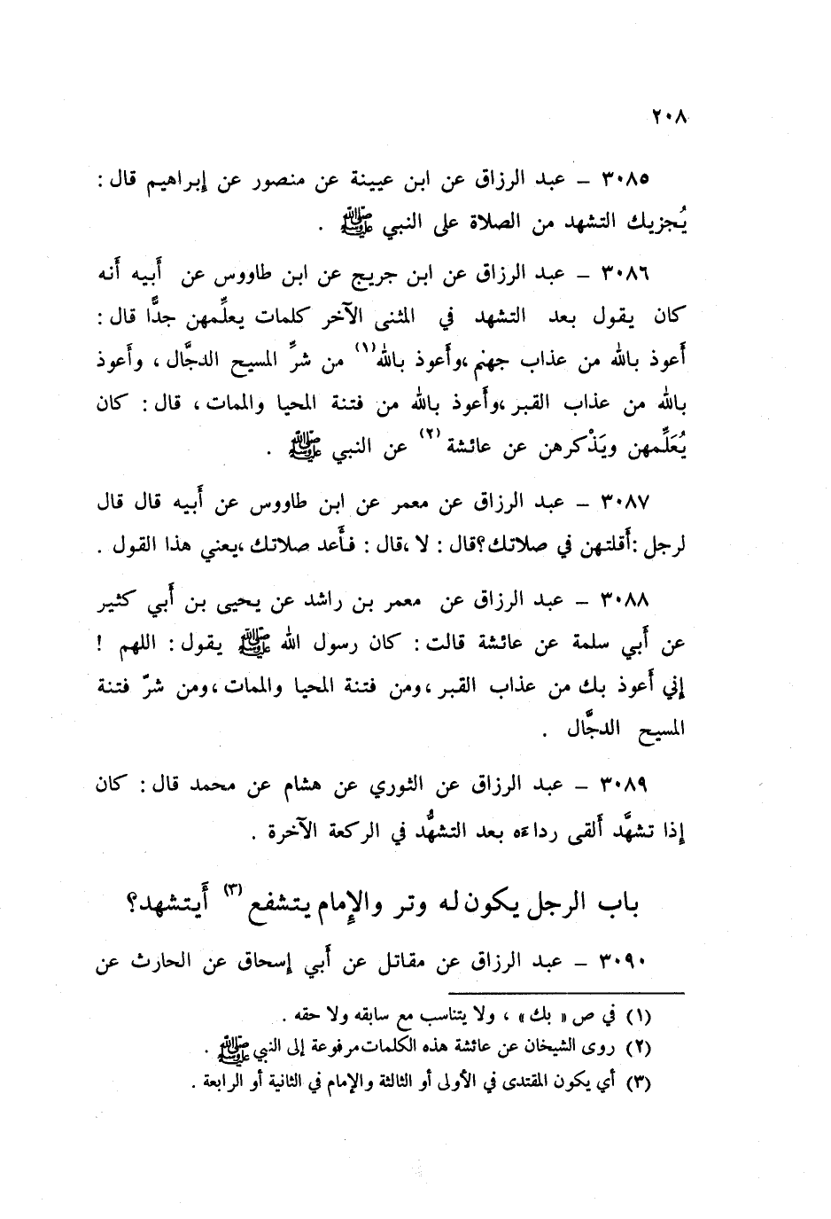 3086 - عَنِ ابْنِ جُرَيْجٍ، عَنِ ابْنِ طَاوُسٍ، عَنْ أَبِيهِ، أَنَّهُ كَانَ يَقُولُ بَعْدَ التَّشَهُّدِ فِي الْمَثْنَى الْآخِرِ كَلِمَاتٍ يُعَلِّمُهُنَّ جِدَّا قَالَ: «§أَعُوذُ بِاللَّهِ مِنْ عَذَابِ جَهَنَّمَ، وَأَعُوذُ بِاللَّهِ مِنْ شَرِّ الْمَسِيحِ الدَّجَالِ، وَأَعُوذُ بِاللَّهِ مِنْ عَذَابِ الْقَبْرِ، وَأَعُوذُ بِاللَّهِ مِنْ فِتْنَةِ الْمَحْيَا وَالْمَمَاتِ» قَالَ: كَانَ يُعَلِّمُهُنَّ وَيَذْكُرُهُنَّ عَنْ عَائِشَةَ، عَنِ النَّبِيِّ صَلَّى اللهُ عَلَيْهِ وَسَلَّمَ عَبْدُ الرَّزَّاقِ،