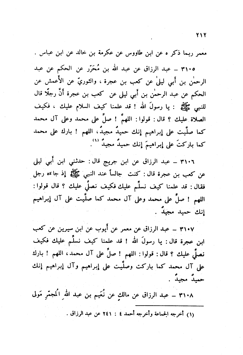3106 - عَنِ ابْنِ جُرَيْجٍ قَالَ: حَدَّثَنِي ابْنُ أَبِي لَيْلَى، عَنْ كَعْبِ بْنِ عُجْرَةَ قَالَ: كُنْتُ جَالِسًا عِنْدَ النَّبِيِّ صَلَّى اللهُ عَلَيْهِ وَسَلَّمَ إِذْ جَاءَهُ رَجُلٌ، فَقَالَ: قَدْ عَلِمْنَا كَيْفَ نُسَلِّمُ عَلَيْكَ، فَكَيْفَ نُصَلِّي عَلَيْكَ؟ قَالَ: " قُولُوا: §اللَّهُمَّ صَلِّ عَلَى مُحَمَّدٍ وَعَلَى آلِ مُحَمَّدٍ، كَمَا صَلَّيْتَ عَلَى آلِ إِبْرَاهِيمَ إِنَّكَ حَمِيدٌ مَجِيدٌ "