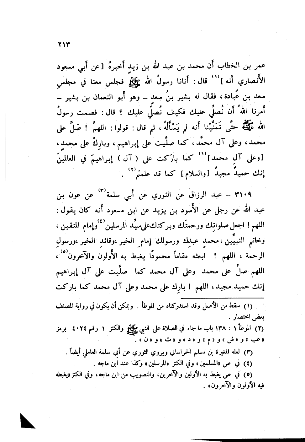 3109 - عَنِ الثَّوْرِيِّ، عَنْ أَبِي سَلَمَةَ، عَنْ عَوْنِ بْنِ عَبْدِ اللَّهِ، عَنْ رَجُلٍ، عَنِ الْأَسْوَدِ بْنِ يَزِيدَ، عَنِ ابْنِ مَسْعُودٍ، أَنَّهُ كَانَ يَقُولُ: «§اللَّهُمَّ اجْعَلْ صَلَوَاتِكَ وَرَحْمَتَكَ وَبَرَكَتَكَ عَلَى سَيِّدِ الْمُرْسَلِينَ وَإِمَامِ الْمُتَّقِينَ، وَخَاتَمِ النَّبِيِّينَ مُحَمَّدٍ عَبْدِكَ وَرَسُولِكَ إِمَامِ الْخَيْرِ، وَقَائِدِ الْخَيْرِ وَرَسُولِ الرَّحْمَةِ، اللَّهُمَّ ابْعَثْهُ مَقَامًا مَحْمُودًا يَغْبِطُ بِهِ الْأَوَّلُونَ وَالْآخِرُونَ، اللَّهُمَّ صَلِّ عَلَى مُحَمَّدٍ وَعَلَى آلِ مُحَمَّدٍ، كَمَا صَلَّيْتَ عَلَى آلِ إِبْرَاهِيمَ إِنَّكَ حَمِيدٌ مَجِيدٌ، اللَّهُمَّ بَارِكْ عَلَى مُحَمَّدٍ وَعَلَى آلِ مُحَمَّدٍ، كَمَا بَارَكْتَ عَلَى آلِ إِبْرَاهِيمَ إِنَّكَ حَمِيدٌ مَجِيدٌ»