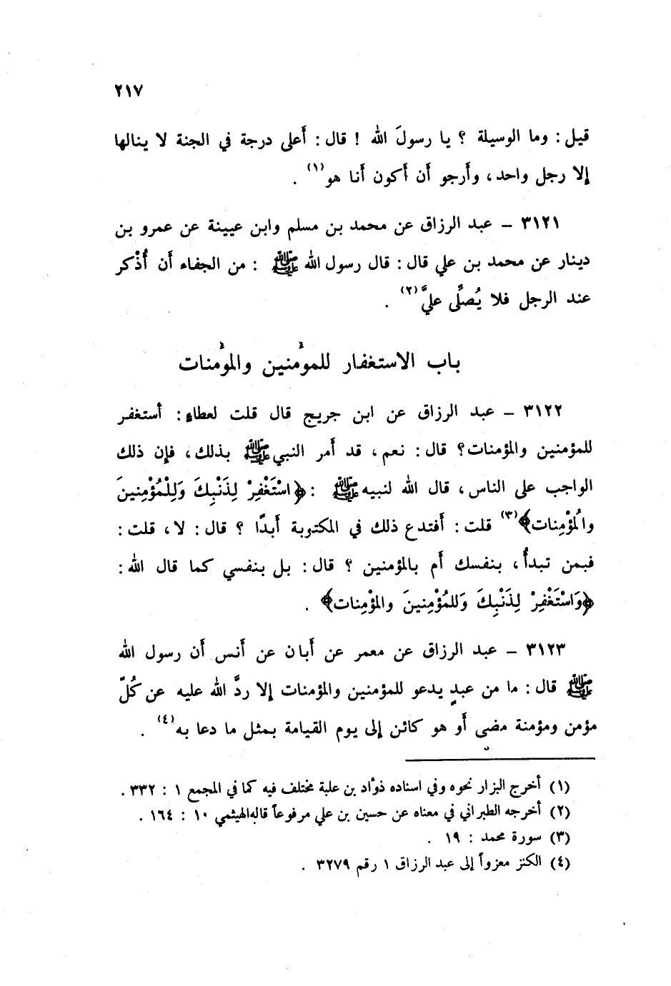 3122 - عَنِ ابْنِ جُرَيْجٍ قَالَ: قُلْتُ لِعَطَاءٍ: أَسْتَغْفِرُ لِلْمُؤْمِنِينَ وَالْمُؤْمِنَاتِ؟ قَالَ: " نَعَمْ، قَدْ أَمَرَ النَّبِيُّ صَلَّى اللهُ عَلَيْهِ وَسَلَّمَ بِذَلِكَ فَإِنَّ ذَلِكَ الْوَاجِبُ عَلَى النَّاسِ، قَالَ اللَّهُ لِنَبِيِّهِ صَلَّى اللهُ عَلَيْهِ وَسَلَّمَ: {§اسْتَغْفِرْ لِذَنْبِكَ وَلِلْمُؤْمِنِينَ وَالْمُؤْمِنَاتِ} [محمد: 19] " قُلْتُ: أَفَتَدَعُ ذَلِكَ فِي الْمَكْتُوبَةِ أَبَدًا؟ قَالَ: «لَا» قُلْتُ: فَبِمَنْ تَبْدَأُ، بِنَفْسِكَ أَمْ بِالْمُؤْمِنِينَ؟ قَالَ: " بَلْ بِنَفْسِي كَمَا قَالَ اللَّهُ: {وَاسْتَغْفِرْ لِذَنْبِكَ وَلِلْمُؤْمِنِينَ وَالْمُؤْمِنَاتِ} [محمد: 19] "