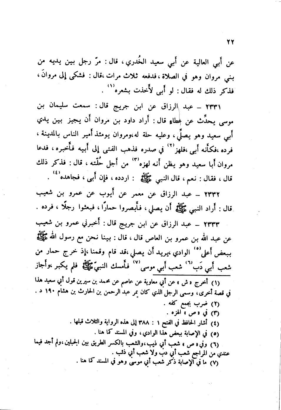 2333 - عَنِ ابْنِ جُرَيْجٍ قَالَ: أَخْبَرَنِي عَمْرُو بْنُ شُعَيْبٍ، عَنْ عَبْدِ اللَّهِ بْنِ عَمْرِو بْنِ الْعَاصِ قَالَ: قَالَ: «بَيْنَا نَحْنُ مَعَ رَسُولِ اللَّهِ صَلَّى اللهُ عَلَيْهِ وَسَلَّمَ بِبَعْضِ أَعْلَى الْوَادِي §يُرِيدُ أَنْ يُصَلِّيَ، قَدْ قَامَ وَقُمْنَا، إِذْ خَرَجَ حِمَارٌ مِنْ شِعْبِ أَبِي دَبٍّ، شِعْبِ أَبِي مُوسَى، فَأَمْسَكَ النَّبِيُّ صَلَّى اللهُ عَلَيْهِ وَسَلَّمَ فَلَمْ يُكَبِّرْ، وَأَجَازَ إِلَيْهِ يَعْقُوبُ بْنُ زَمَعَةَ، أَخُو بَنِي أَسَدٍ حَتَّى رَدَّهُ»