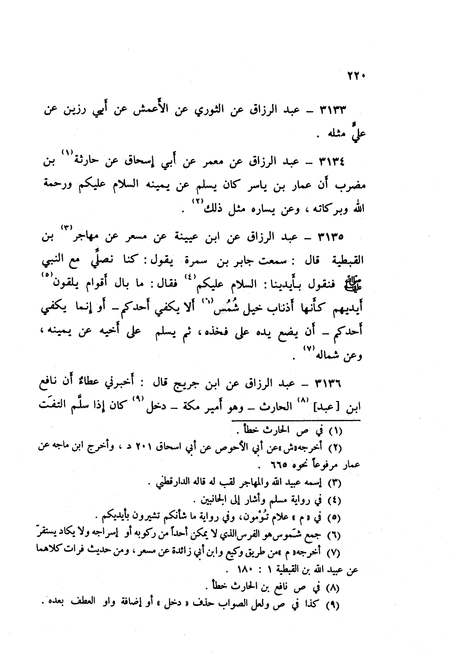 3136 - عَنِ ابْنِ جُرَيْجٍ قَالَ: أَخْبَرَنِي عَطَاءٌ، أَنَّ نَافِعَ بْنَ عَبْدِ الْحَارِثِ - وَهُوَ أَمِيرُ مَكَّةَ - دَخَلَ، كَانَ إِذَا سَلَّمَ الْتَفَتَ فَيُسَلِّمُ عَنْ يَمِينِهِ، ثُمَّ يُسَلِّمُ عَنْ شِمَالِهِ، فَبَلَّغْتُ ابْنَ مَسْعُودٍ، فَقَالَ: أَنَّى أَخَذَهَا ابْنُ عَبْدِ الْحَارِثِ؟ قَالَ ابْنُ جُرَيْجٍ: وَبَلَغَنِي أَنَّ ابْنَ مَسْعُودٍ قَالَ: «أَنَّى أَخَذَهَا؟ فَإِنِّي §رَأَيْتُ بَيَاضَ وَجْهِ رَسُولِ اللَّهِ صَلَّى اللهُ عَلَيْهِ وَسَلَّمَ مِنْ كِلَا الشِّقَّيْنِ إِذَا سَلَّمَ»
