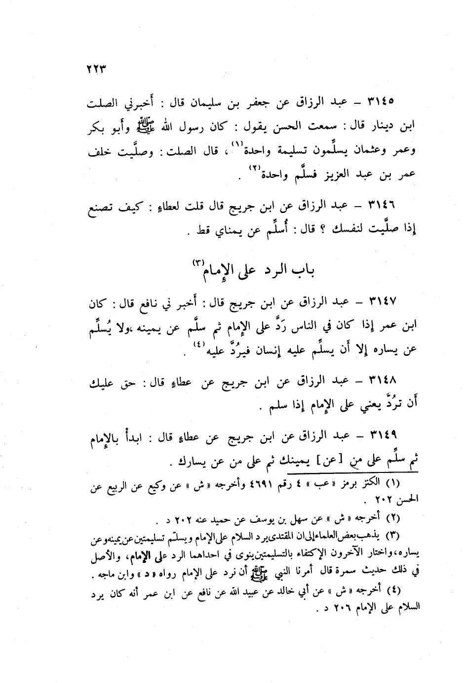 3148 - عَنِ ابْنِ جُرَيْجٍ، عَنْ عَطَاءٍ قَالَ: «§حَقٌّ عَلَيْكَ أَنْ تَرُدَّ - يَعْنِي عَلَى الْإِمَامِ - إِذَا سَلَّمَ»