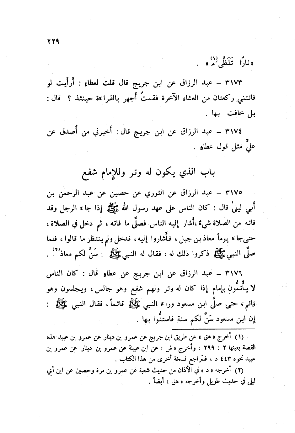 3176 - عَنِ ابْنِ جُرَيْجٍ، عَنْ عَطَاءٍ قَالَ: كَانَ النَّاسُ لَا يَأْتَمُّونَ بِإِمَامٍ إِذَا كَانَ لَهُ وِتْرٌ وَلَهُمْ شَفْعٌ وَهُوَ جَالِسٌ، وَيَجْلِسُونَ وَهُوَ قَائِمٌ، حَتَّى صَلَّى ابْنُ مَسْعُودٍ وَرَاءَ النَّبِيِّ صَلَّى اللهُ عَلَيْهِ وَسَلَّمَ قَائِمًا، فَقَالَ النَّبِيُّ صَلَّى اللهُ عَلَيْهِ وَسَلَّمَ: «إِنَّ §ابْنَ مَسْعُودٍ سَنَّ لَكُمْ سُنَّةً فَاسْتَنُّوا بِهَا»