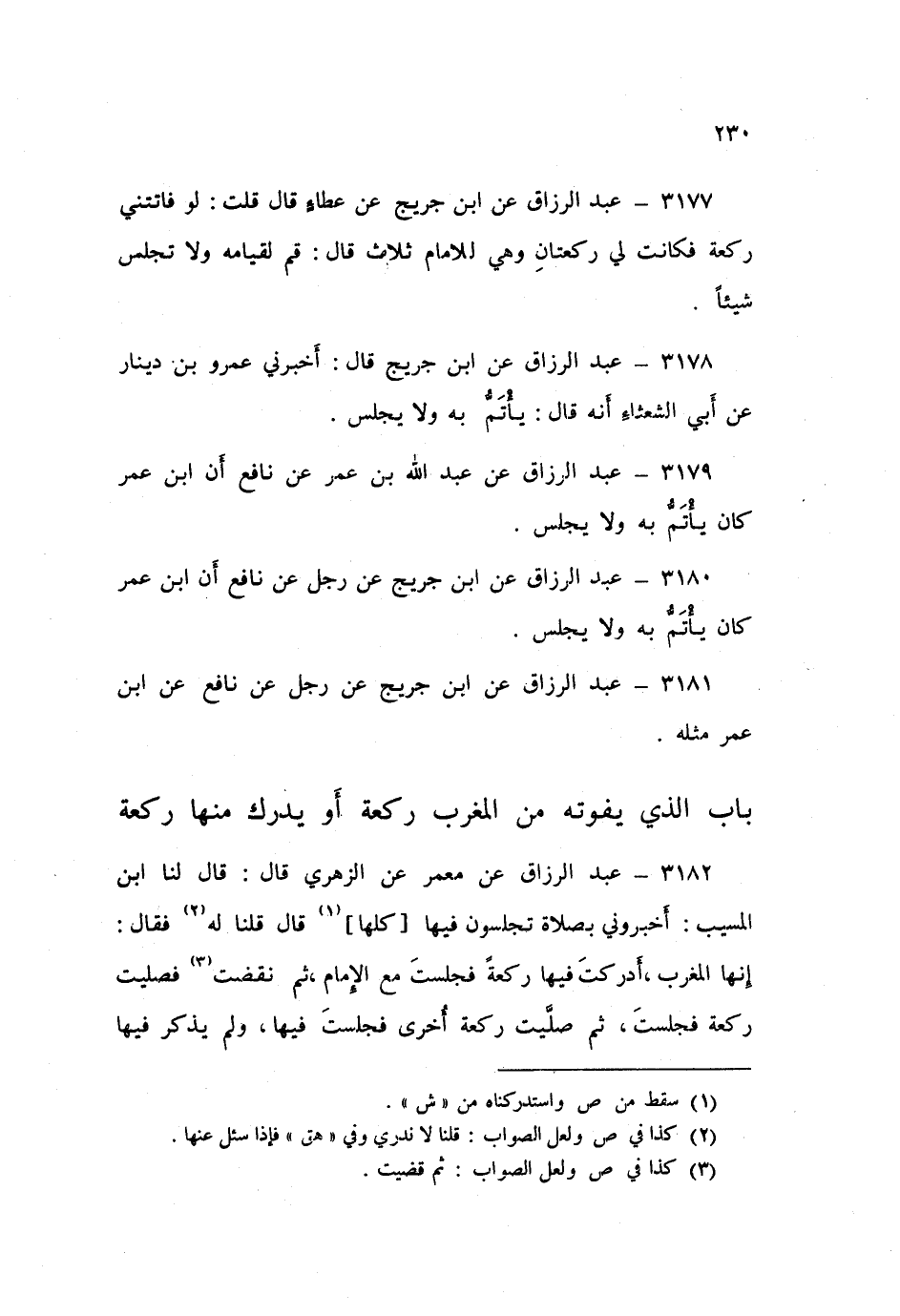 3182 - عَنْ مَعْمَرٍ، عَنِ الزُّهْرِيِّ قَالَ: قَالَ لَنَا ابْنُ الْمُسَيِّبِ: «§أَخْبِرُونِي بِصَلَاةٍ، تَجْلِسُونَ فِيهَا كُلِّهَا؟» قَالَ: قُلْنَا لَهُ، فَقَالَ: «إِنَّهَا الْمَغْرِبُ، أَدْرَكْتَ فِيهَا رَكْعَةً فَجَلَسْتَ مَعَ الْإِمَامِ، ثُمَّ نَقَضْتَ فَصَلَّيْتَ رَكْعَةً، فَجَلَسْتَ، ثُمَّ صَلَّيْتَ رَكْعَةً أُخْرَى فَجَلَسْتَ فِيهَا، وَلَمْ يَذْكُرْ فِيهَا سُجُودًا»