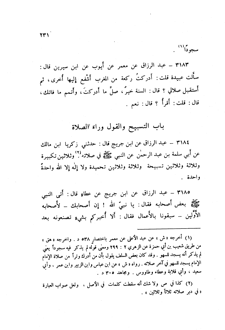 3184 - عَنِ ابْنِ جُرَيْجٍ قَالَ: حَدَّثَنِي زَكَرِيَّا بْنُ مَالِكٍ، عَنْ أَبِي سَلَمَةَ بْنِ عَبْدِ الرَّحْمَنِ، عَنِ النَّبِيِّ صَلَّى اللهُ عَلَيْهِ وَسَلَّمَ «§فِي دُبُرِ صَلَاتِهِ ثَلَاثَةً وَثَلَاثِينَ تَكْبِيرَةً وَثَلَاثَةً وَثَلَاثِينَ تَسْبِيحَةً وَثَلَاثَةً وَثَلَاثِينَ تَحْمِيدَةً، وَلَا إِلَهَ إِلَّا اللَّهُ وَاحِدَةً وَاحِدَةً»