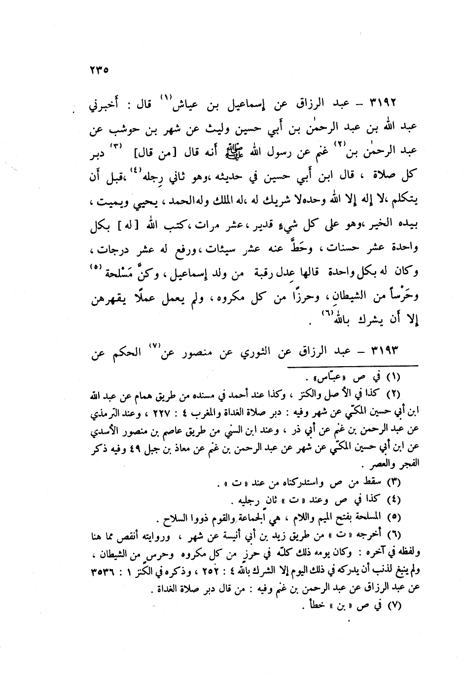3193 - عَنِ الثَّوْرِيِّ، عَنْ مَنْصُورٍ، عَنِ الْحَكَمِ، عَنْ عَبْدِ الرَّحْمَنِ بْنِ أَبِي لَيْلَى، عَنْ كَعْبِ بْنِ عُجْرَةَ، عَنْ رَسُولِ اللَّهِ صَلَّى اللهُ عَلَيْهِ وَسَلَّمَ قَالَ: " §مُعَقِّبَاتٌ لَا يَخِيبُ قَائِلُهُنَّ - أَوْ قَالَ: فَاعِلُهُنَّ - مَنْ سَبَّحَ اللَّهَ دُبُرَ كُلِّ صَلَاةٍ ثَلَاثًا وَثَلَاثِينَ، وَحَمِدَ ثَلَاثًا وَثَلَاثِينَ، وَكَبَّرَ أَرْبَعًا وَثَلَاثِينَ "