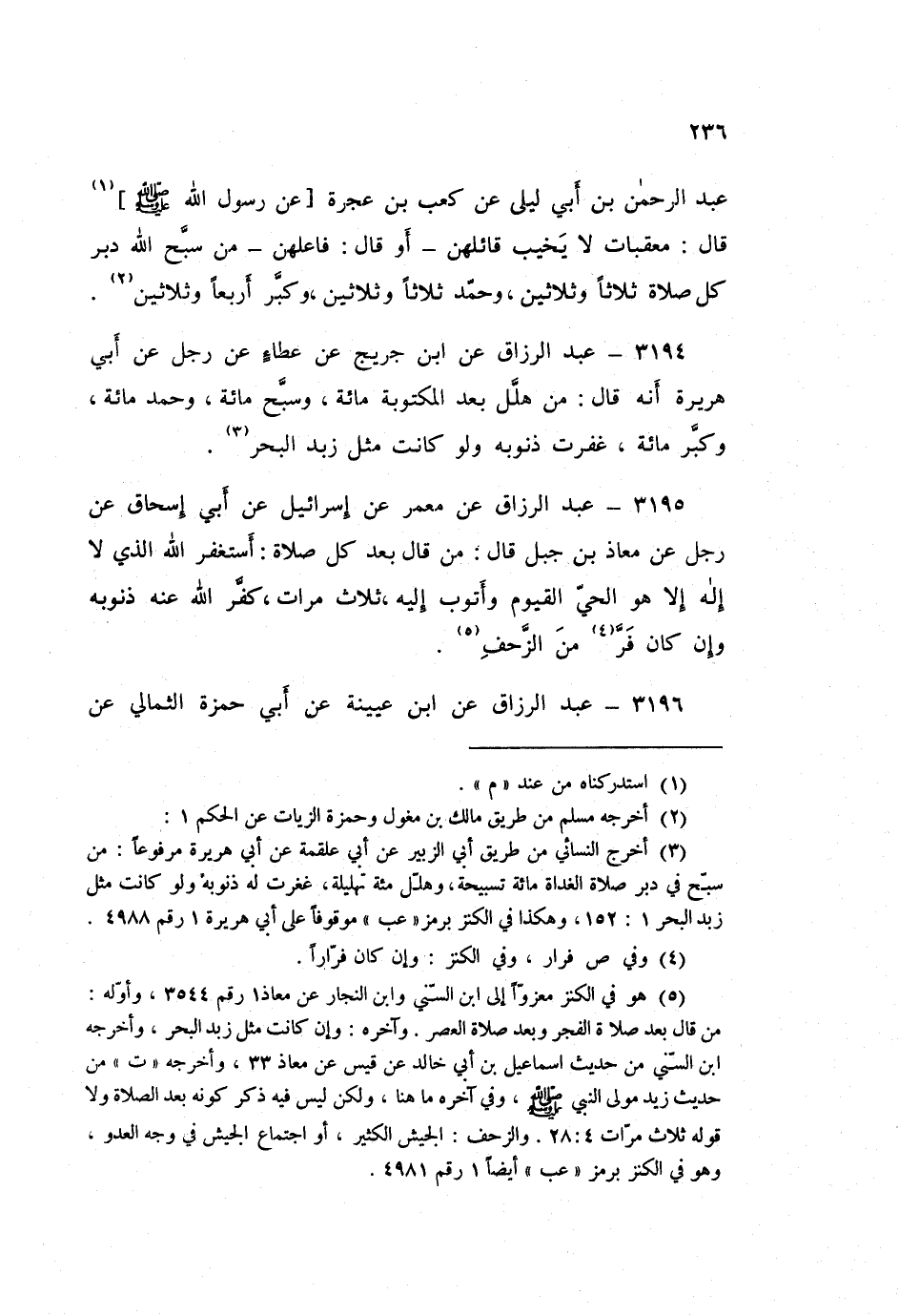 3195 - عَنْ مَعْمَرٍ، عَنْ إِسْرَائِيلَ، عَنْ أَبِي إِسْحَاقَ، عَنْ رَجُلٍ، عَنْ مُعَاذِ بْنِ جَبَلٍ قَالَ: " §مَنْ قَالَ بَعْدَ كُلِّ صَلَاةٍ: أَسْتَغْفِرُ اللَّهَ الَّذِي لَا إِلَهَ إِلَّا هُوَ الْحَيَّ الْقَيُّومَ وَأَتُوبُ إِلَيْهِ، ثَلَاثَ مَرَّاتٍ، كَفَّرَ اللَّهُ عَنْهُ ذُنُوبَهُ وَإِنْ كَانَ فَرَّ مِنَ الزَّحْفِ "