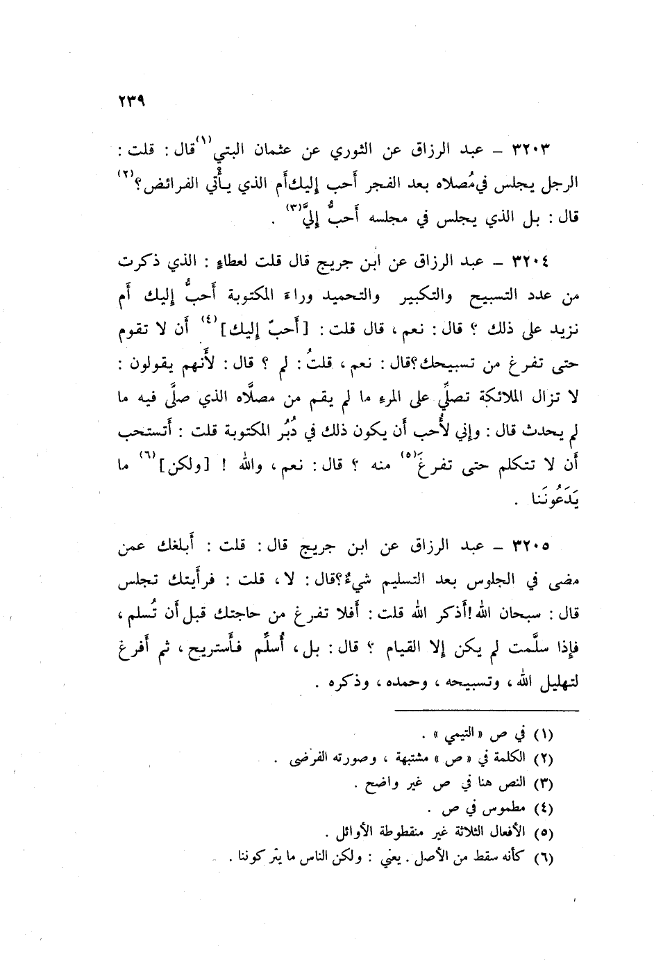 3205 - عَنِ ابْنِ جُرَيْجٍ قَالَ: قُلْتُ: أَبَلَغَكَ عَمَّنْ مَضَى فِي الْجُلُوسِ بَعْدَ التَّسْلِيمِ شَيْءٌ؟ قَالَ: «لَا» قُلْتُ: فَرَأَيْتُكَ تَجْلِسُ قَالَ: «سُبْحَانَ اللَّهِ أَذْكُرُ اللَّهَ» قُلْتُ: أَفَلَا تَفْرُغُ مِنْ حَاجَتِكَ قَبْلَ أَنْ تُسَلِّمَ، فَإِذَا سَلَّمْتَ لَمْ يَكُنْ إِلَّا الْقِيَامِ؟ قَالَ: «بَلْ §أُسَلِّمُ فَأَسْتَرِيحُ، ثُمَّ أَفْرُغُ لِتَهْلِيلِ اللَّهِ، وَتَسْبِيحِهِ، وَحَمْدِهِ، وَذِكْرِهِ»