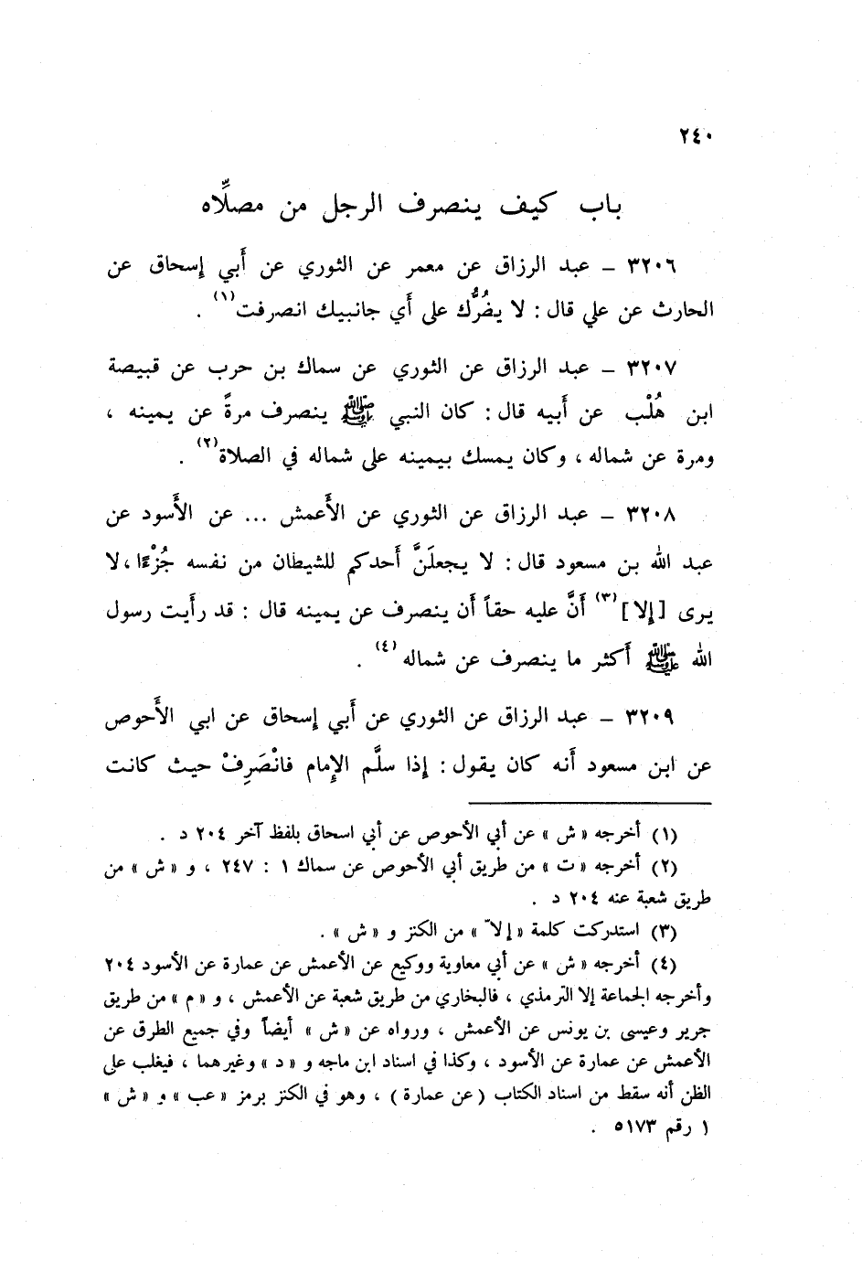 3208 - عَنِ الثَّوْرِيِّ، عَنِ الْأَعْمَشِ، عَنِ الْأَسْوَدِ، عَنْ عَبْدِ اللَّهِ بْنِ مَسْعُودٍ قَالَ: لَا يَجْعَلَنَّ أَحَدُكُمْ لِلشَّيْطَانِ مِنْ نَفْسِهِ جُزْءًا، لَا يَرَى إِلَّا أَنَّ عَلَيْهِ حَقًّا أَنْ يَنْصَرِفَ عَنْ يَمِينِهِ قَالَ: «قَدْ رَأَيْتُ رَسُولَ اللَّهِ صَلَّى اللهُ عَلَيْهِ وَسَلَّمَ §أَكْثَرَ مَا يَنْصَرِفُ عَنْ شِمَالِهِ»
