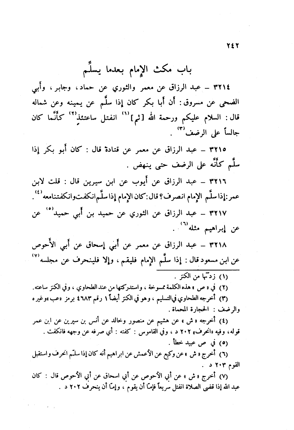 3214 - عَنْ مَعْمَرٍ، وَالثَّوْرِيِّ، عَنْ حَمَّادٍ، وَجَابِرٍ، وَأَبِي الضُّحَى، عَنْ مَسْرُوقٍ، أَنَّ أَبَا بَكْرٍ، كَانَ إِذَا سَلَّمَ عَنْ يَمِينِهِ، وَعَنْ شِمَالِهِ قَالَ: «§السَّلَامُ عَلَيْكُمْ وَرَحْمَةُ اللَّهِ»، ثُمَّ انْفَتَلَ سَاعَتَئِذٍ كَأَنَّمَا كَانَ جَالِسًا عَلَى الرَّضَفِ