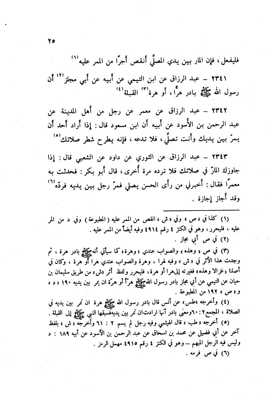 2342 - عَنْ مَعْمَرٍ، عَنْ رَجُلٍ، مِنْ أَهْلِ الْمَدِينَةِ، عَنْ عَبْدِ الرَّحْمَنِ بْنِ الْأَسْوَدِ، عَنْ أَبِيهِ، أَنَّ ابْنَ مَسْعُودٍ قَالَ: «§إِذَا أَرَادَ أَحَدٌ أَنْ يَمُرَّ بَيْنَ يَدَيْكَ وَأَنْتَ تُصَلِّي فَلَا تَدَعْهُ، فَإِنَّهُ يَطْرَحُ شَطْرَ صَلَاتِكَ»