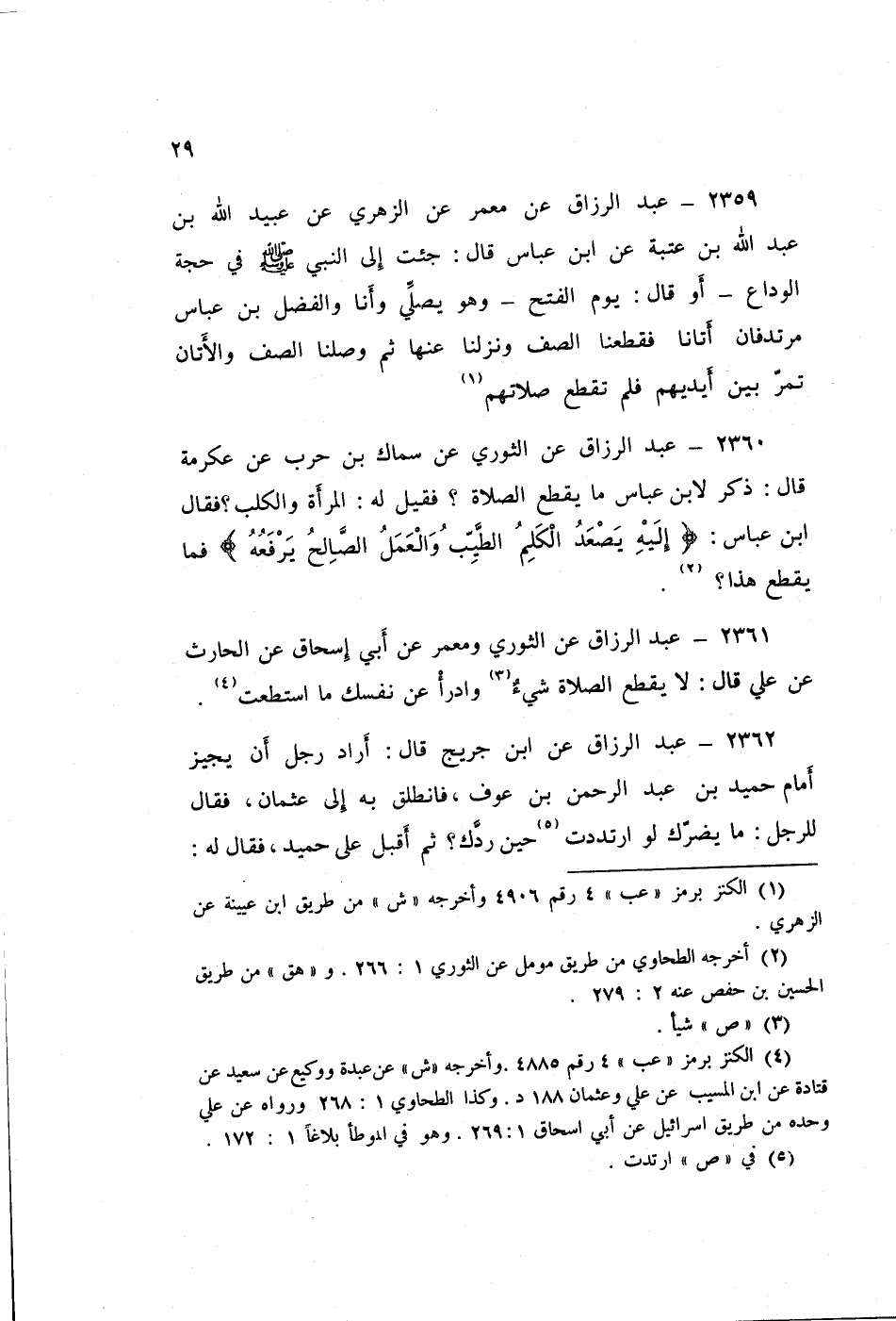 2362 - عَنِ ابْنِ جُرَيْجٍ قَالَ: أَرَادَ رَجُلٌ أَنْ يُجِيزَ، أَمَامَ حُمَيْدِ بْنِ عَبْدِ الرَّحْمَنِ بْنِ عَوْفٍ فَانْطَلَقَ بِهِ إِلَى عُثْمَانَ، فَقَالَ لِلرَّجُلِ: «مَا يَضُرُّكَ لَوِ ارْتَدَدْتَ حِينَ رَدَّكَ؟» ثُمَّ أَقْبَلَ عَلَى حُمَيْدٍ، فَقَالَ لَهُ: «مَا ضَرَّكَ لَوْ أَجَازَ أمَامَكَ؟ إِنِّ §الصَّلَاةَ لَا يَقْطَعُهَا شَيْءٌ إِلَّا الْكَلَامُ وَالْإِحْدَاثُ» قَالَ عَبْدُ الرَّزَّاقِ: ذَكَرَهُ ابْنُ جُرَيْجٍ، عَنْ مُحَمَّدِ بْنِ يُوسُفَ، عَنْ إِبْرَاهِيمَ بْنِ عَبْدِ الرَّحْمَنِ بْنِ عَوْفٍ
