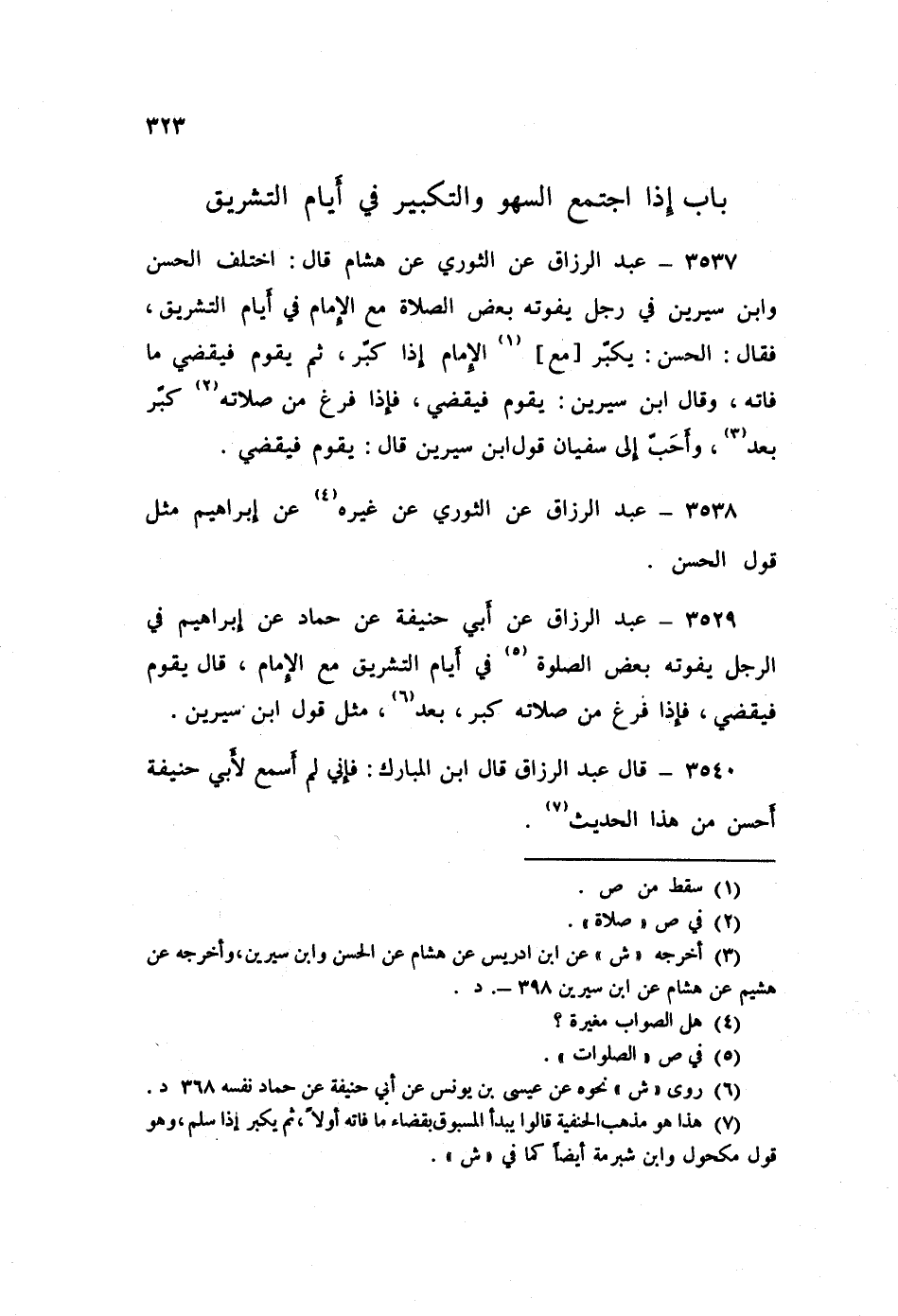 3537 - عَنِ الثَّوْرِيِّ، عَنْ هِشَامٍ قَالَ: اخْتَلَفَ الْحَسَنُ، وَابْنُ سِيرِينَ فِي رَجُلٍ يَفُوتُهُ بَعْضُ الصَّلَاةِ مَعَ الْإِمَامِ فِي أَيَّامِ التَّشْرِيقِ، فَقَالَ الْحَسَنُ: «§يُكَبِّرُ مَعَ الْإِمَامِ إِذَا كَبَّرَ، ثُمَّ يَقُومُ فَيَقْضِيَ مَا فَاتَهُ»، وَقَالَ ابْنُ سِيرِينَ: «يَقُومُ فَيَقْضِيَ، فَإِذَا فَرَغَ مِنْ صَلَاتِهِ كَبَّرَ بَعْدُ» وَأَحَبُّ إِلَى سُفْيَانَ قَوْلُ ابْنِ سِيرِينَ قَالَ: «يَقُومُ فَيَقْضِيَ» عَبْدُ الرَّزَّاقِ،
