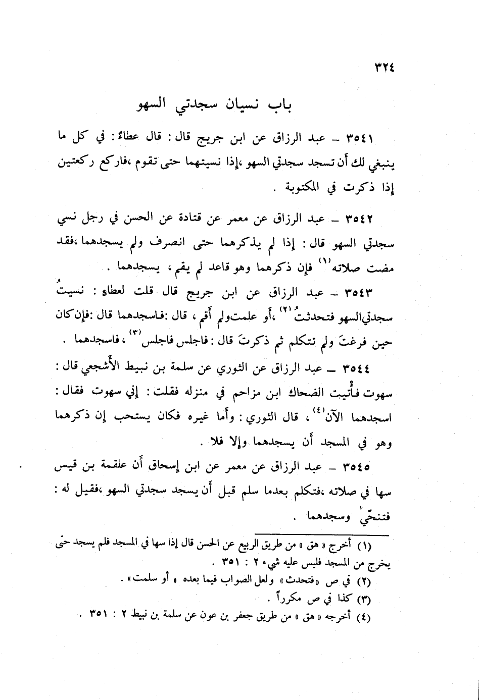 3543 - عَنِ ابْنِ جُرَيْجٍ قَالَ: قُلْتُ لِعَطَاءٍ: §نَسِيتُ سَجْدَتَيِ السَّهْوِ فَتَحَدَّثْتُ أَوْ عَلِمْتُ وَلَمْ أَقُمْ قَالَ: «فَاسْجُدْهُمَا» قَالَ: فَإِنْ كَانَ حِينَ فَرَغْتَ وَلَمْ تَتَكَلَّمْ ثُمَّ ذَكَرْتَ قَالَ: «فَاجْلِسْ فَاجْلِسْ، فَاسْجُدْهُمَا»