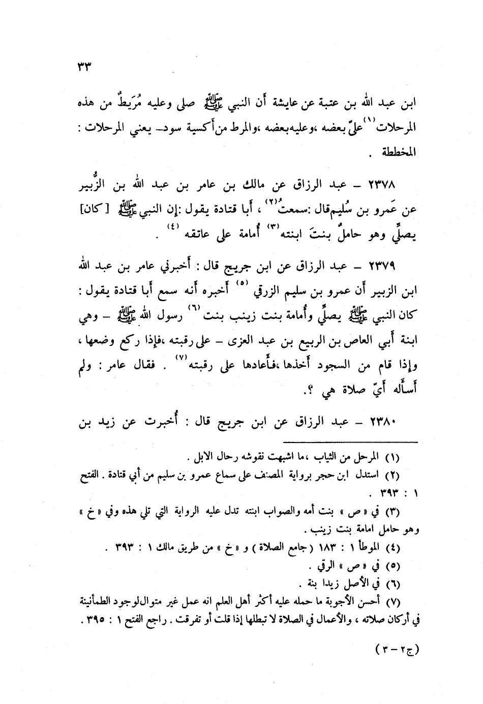 2379 - عَنِ ابْنِ جُرَيْجٍ قَالَ: أَخْبَرَنِي عَامِرُ بْنُ عَبْدِ اللَّهِ بْنِ الزُّبَيْرِ، أَنَّ عَمْرَو بْنَ سُلَيْمٍ الزُّرْقِيَّ أَخْبَرَهُ، أَنَّهُ سَمِعَ أَبَا قَتَادَةَ يَقُولُ: «كَانَ النَّبِيُّ صَلَّى اللهُ عَلَيْهِ وَسَلَّمَ §يُصَلِّي وَأُمَامَةُ بِنْتُ زَيْنَبَ بِنْتُ رَسُولِ اللَّهِ صَلَّى اللهُ عَلَيْهِ وَسَلَّمَ - وَهِيَ ابْنَةُ أَبِي الْعَاصِ بْنِ الرَّبِيعِ بْنِ عَبْدِ الْعُزَّى - عَلَى رَقَبَتِهِ، فَإِذَا رَكَعَ وَضَعَهَا، وَإِذَا قَامَ مِنَ السُّجُودِ أَخَذَهَا فَأَعَادَهَا عَلَى رَقَبَتِهِ» فَقَالَ عَامِرٌ: «وَلَمْ أَسْأَلْهُ أَيُّ صَلَاةٍ هِيَ؟» عَبْدُ الرَّزَّاقِ،