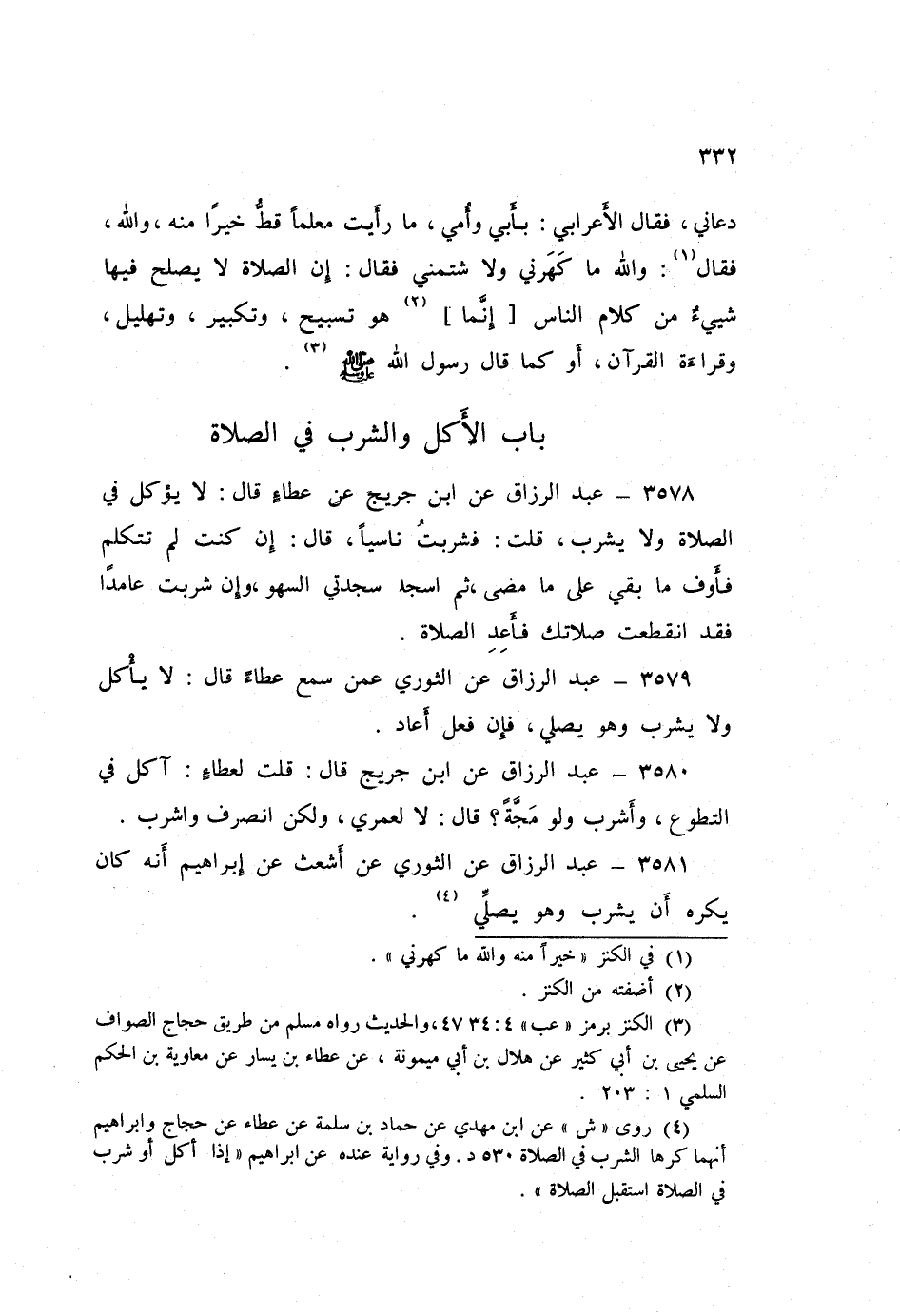3578 - عَنِ ابْنِ جُرَيْجٍ، عَنْ عَطَاءٍ قَالَ: «§لَا يُؤْكَلُ فِي الصَّلَاةِ وَلَا يُشْرَبُ»، قُلْتُ: فَشَرِبْتُ نَاسِيًا قَالَ: «إِنْ كُنْتَ لَمْ تَتَكَلَّمْ فَأَوْفِ مَا بَقِيَ عَلَى مَا مَضَى، ثُمَّ اسْجُدْ سَجْدَتَيِ السَّهْوِ، وَإِنْ شَرِبْتَ عَامِدًا فَقَدِ انْقَطَعَتْ صَلَاتُكَ فَأَعِدِ الصَّلَاةَ»