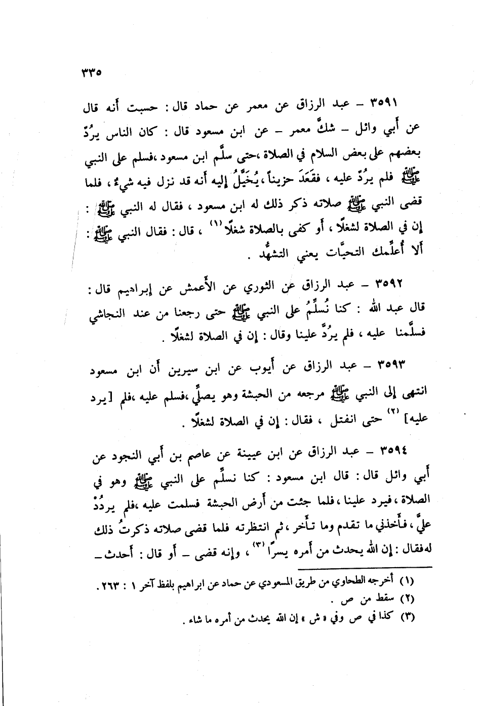 3592 - عَنِ الثَّوْرِيِّ، عَنِ الْأَعْمَشِ، عَنْ إِبْرَاهِيمَ قَالَ: قَالَ عَبْدُ اللَّهِ: كُنَّا نُسَلِّمُ عَلَى النَّبِيِّ صَلَّى اللهُ عَلَيْهِ وَسَلَّمَ حَتَّى رَجَعْنَا مِنْ عِنْدِ النَّجَاشِيِّ، فَسَلَّمْنَا عَلَيْهِ، فَلَمْ يَرُدَّ عَلَيْنَا، وَقَالَ: «إِنَّ §فِي الصَّلَاةِ لَشُغْلًا»