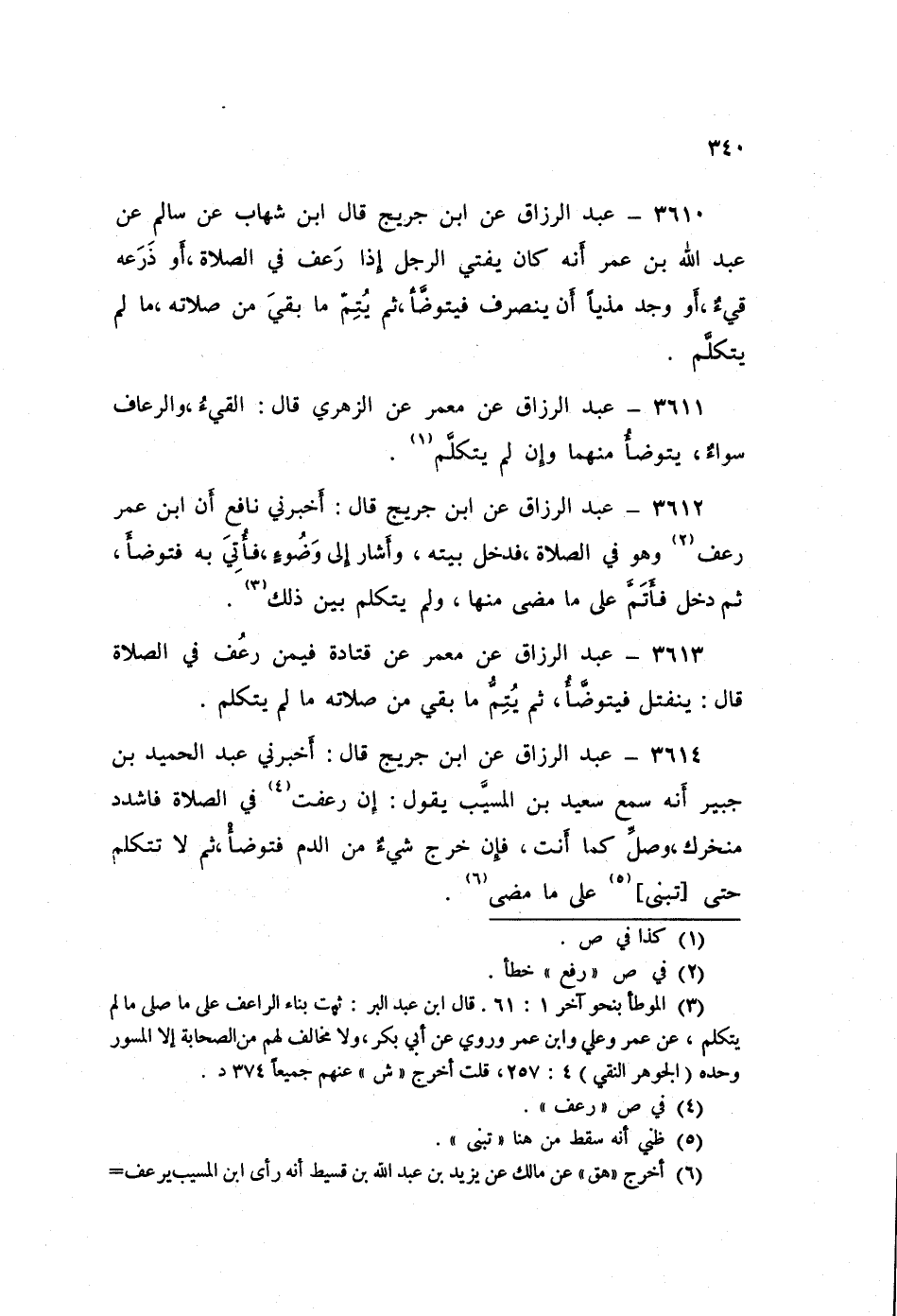 3612 - عَنِ ابْنِ جُرَيْجٍ قَالَ: أَخْبَرَنِي نَافِعٌ «أَنَّ ابْنَ عُمَرَ §رَعَفَ وَهُوَ فِي الصَّلَاةِ، فَدَخَلَ بَيْتَهُ، وَأَشَارَ إِلَى وَضُوءٍ، فَأُتِيَ بِهِ فَتَوَضَّأَ، ثُمَّ دَخَلَ فَأَتَمَّ عَلَى مَا مَضَى مِنْهَا، وَلَمْ يَتَكَلَّمْ بَيْنَ ذَلِكَ»