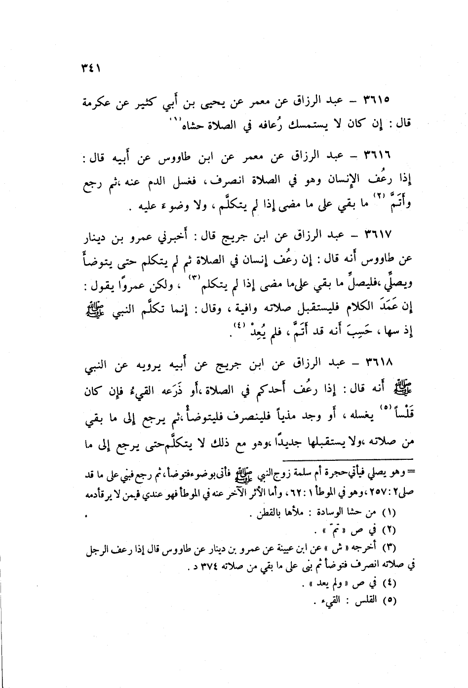 3616 - عَنْ مَعْمَرٍ، عَنِ ابْنِ طَاوُسٍ، عَنْ أَبِيهِ قَالَ: «§إِذَا رَعَفَ الْإِنْسَانُ وَهُوَ فِي الصَّلَاةِ انْصَرَفَ، فَغَسَلَ الدَّمَ عَنْهُ، ثُمَّ رَجِعَ وَأَتَمَّ مَا بَقِيَ عَلَى مَا مَضَى إِذَا لَمْ يَتَكَلَّمْ، وَلَا وُضُوءَ عَلَيْهِ»